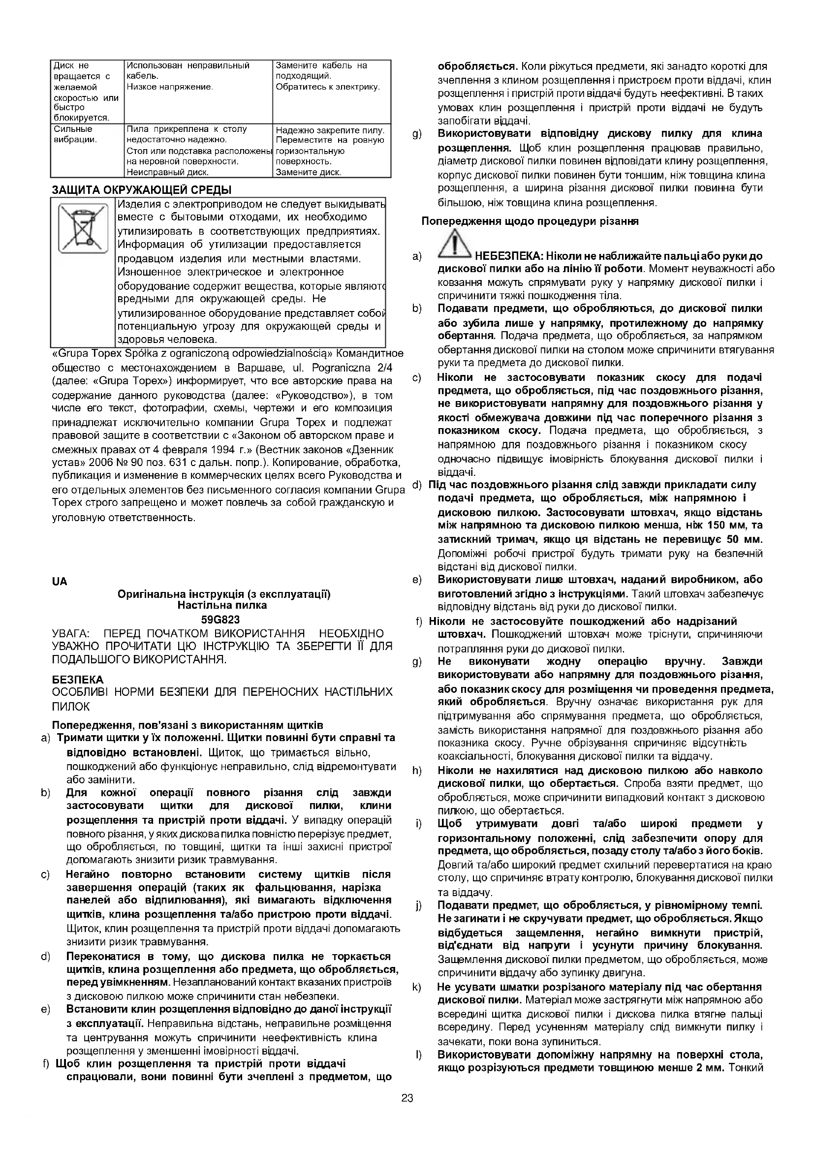 Оригінальна інструкція (з експлуатації) Настільна пилка 59G823 УВАГА: ПЕРЕД ПОЧАТКОМ ВИКОРИСТАННЯ НЕОБХІДНО УВАЖНО ПРОЧИТАТИ ЦЮ ІНСТРУКЦІЮ ТА ЗБЕРЕГТИ ЇЇ ДЛЯ ПОДАЛЬШОГО ВИКОРИСТАННЯ.