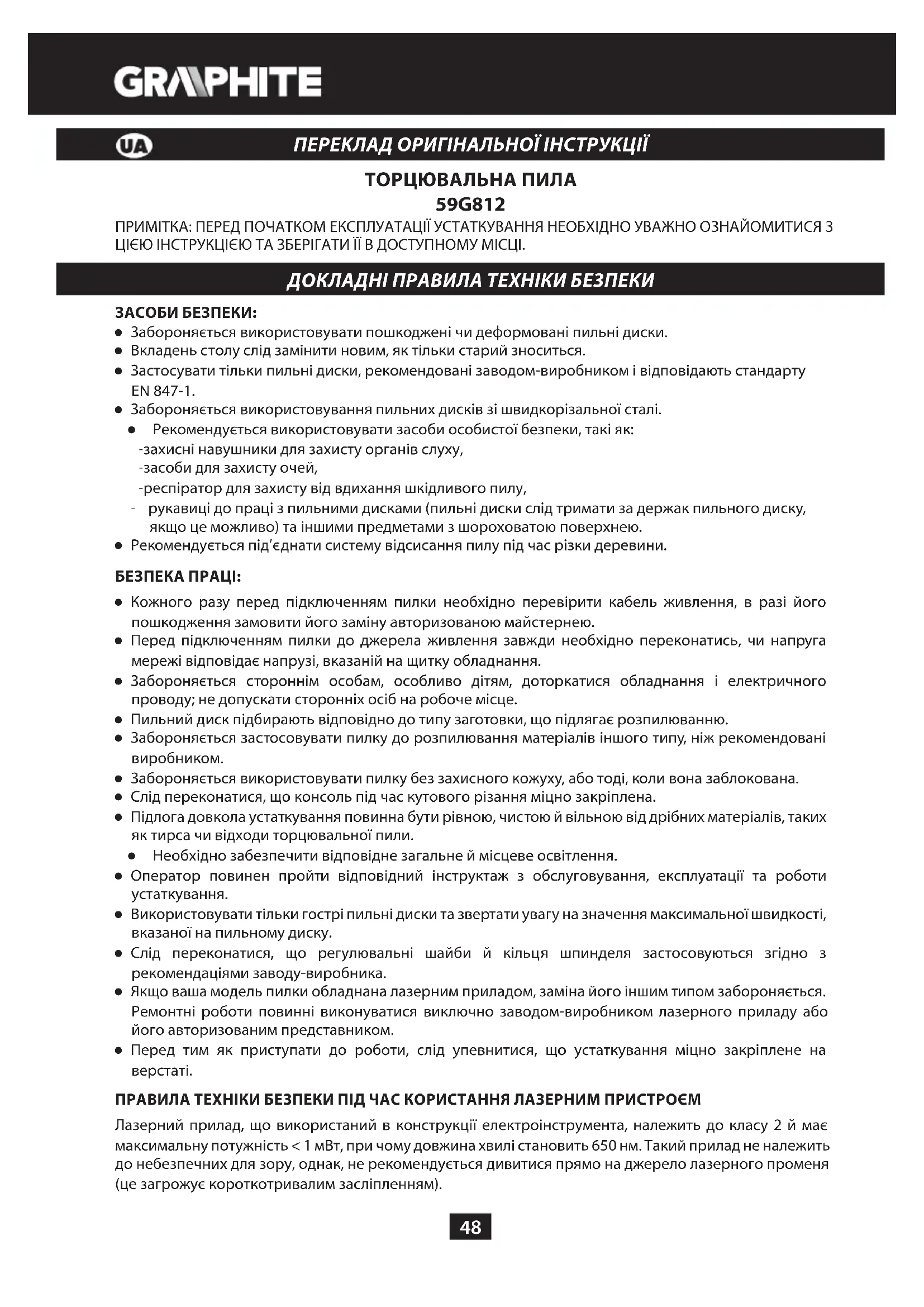 2ХХХ – год изготовления, YY – месяц изготовления G- код торговой марки (первая буква) ***** - порядковый номер изделия Изготовлено в КНР для GRUPA TOPEX Sp. z o.o. Sp. k., ul. Pograniczna 2/4, 02-285 Warszawa, Польша48 ПЕРЕКЛАД ОРИГІНАЛЬНОЇ ІНСТРУКЦІЇ ТОРЦЮВАЛЬНА ПИЛА 59G812 ПРИМІТКА: ПЕРЕД ПОЧАТКОМ ЕКСПЛУАТАЦІЇ УСТАТКУВАННЯ НЕОБХІДНО УВАЖНО ОЗНАЙОМИТИСЯ З ЦІЄЮ ІНСТРУКЦІЄЮ ТА ЗБЕРІГАТИ ЇЇ В ДОСТУПНОМУ МІСЦІ. ДОКЛАДНІ ПРАВИЛА ТЕХНІКИ БЕЗПЕКИ ЗАСОБИ БЕЗПЕКИ: Ɣ Забороняється використовувати пошкоджені чи деформовані пильні диски. Ɣ Вкладень столу слід замінити новим, як тільки старий зноситься. Ɣ Застосувати тільки пильні диски, рекомендовані заводом-виробником і відповідають стандарту EN 847-1. Ɣ Забороняється використовування пильних дисків зі швидкорізальної сталі. Ɣ Рекомендується використовувати засоби особистої безпеки, такі як: - захисні навушники для захисту органів слуху, - засоби для захисту очей, - респіратор для захисту від вдихання шкідливого пилу, - рукавиці до праці з пильними дисками (пильні диски слід тримати за держак пильного диску, якщо це можливо) та іншими предметами з шороховатою поверхнею. Ɣ Рекомендується під’єднати систему відсисання пилу під час різки деревини. БЕЗПЕКА ПРАЦІ: Ɣ Кожного разу перед підключенням пилки необхідно перевірити кабель живлення, в разі його пошкодження замовити його заміну авторизованою майстернею. Ɣ Перед підключенням пилки до джерела живлення завжди необхідно переконатись, чи напруга мережі відповідає напрузі, вказаній на щитку обладнання. Ɣ Забороняється стороннім особам, особливо дітям, доторкатися обладнання і електричного проводу; не допускати сторонніх осіб на робоче місце. Ɣ Пильний диск підбирають відповідно до типу заготовки, що підлягає розпилюванню. Ɣ Забороняється застосовувати пилку до розпилювання матеріалів іншого типу, ніж рекомендовані виробником. Ɣ Забороняється використовувати пилку без захисного кожуху, або тоді, коли вона заблокована. Ɣ Слід переконатися, що консоль під час кутового різання міцно закріплена. Ɣ Підлога довкола устаткування повинна бути рівною, чистою й вільною від дрібних матеріалів, таких як тирса чи відходи торцювальної пили. Ɣ Необхідно забезпечити відповідне загальне й місцеве освітлення. Ɣ Оператор повинен пройти відповідний інструктаж з обслуговування, експлуатації та роботи устаткування. Ɣ Використовувати тільки гострі пильні диски та звертати увагу на значення максимальної швидкості, вказаної на пильному диску. Ɣ Слід переконатися, що регулювальні шайби й кільця шпинделя застосовуються згідно з рекомендаціями заводу-виробника. Ɣ Якщо ваша модель пилки обладнана лазерним приладом, заміна його іншим типом забороняється. Ремонтні роботи повинні виконуватися виключно заводом-виробником лазерного приладу або його авторизованим представником. Ɣ Перед тим як приступати до роботи, слід упевнитися, що устаткування міцно закріплене на