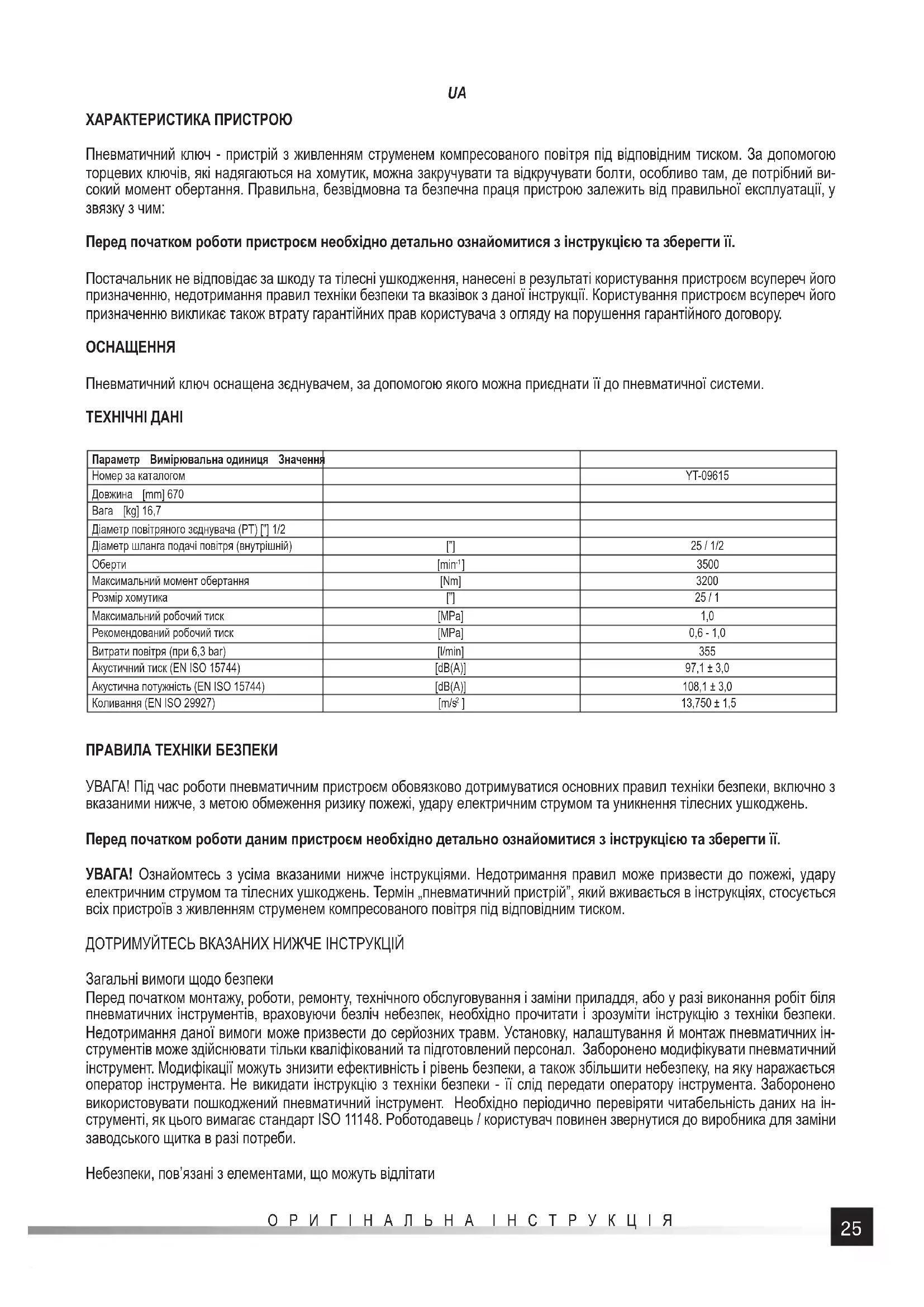 ] 13,750 ± 1,5 ПРАВИЛА ТЕХНІКИ БЕЗПЕКИ УВАГА! Під час роботи пневматичним пристроєм обовязково дотримуватися основних правил техніки безпеки, включно з вказаними нижче, з метою обмеження ризику пожежі, удару електричним струмом та уникнення тілесних ушкоджень. Перед початком роботи даним пристроєм необхідно детально ознайомитися з інструкцією та зберегти її. УВАГА! Ознайомтесь з усіма вказаними нижче інструкціями. Недотримання правил може призвести до пожежі, удару електричним струмом та тілесних ушкоджень. Термін „пневматичний пристрій”, який вживається в інструкціях, стосується всіх пристроїв з живленням струменем компресованого повітря під відповідним тиском. ДОТРИМУЙТЕСЬ ВКАЗАНИХ НИЖЧЕ ІНСТРУКЦІЙ Загальні вимоги щодо безпеки Перед початком монтажу, роботи, ремонту, технічного обслуговування і заміни приладдя, або у разі виконання робіт біля пневматичних інструментів, враховуючи безліч небезпек, необхідно прочитати і зрозуміти інструкцію з техніки безпеки. Недотримання даної вимоги може призвести до серйозних травм. Установку, налаштування й монтаж пневматичних ін- струментів може здійснювати тільки кваліфікований та підготовлений персонал. Заборонено модифікувати пневматичний інструмент. Модифікації можуть знизити ефективність і рівень безпеки, а також збільшити небезпеку, на яку наражається оператор інструмента. Не викидати інструкцію з техніки безпеки - її слід передати оператору інструмента. Заборонено використовувати пошкоджений пневматичний інструмент. Необхідно періодично перевіряти читабельність даних на ін- струменті, як цього вимагає стандарт ISO 11148. Роботодавець / користувач повинен звернутися до виробника для заміни заводського щитка в разі потреби. Небезпеки, пов’язані з елементами, що можуть відлітати26 ОРИГІНАЛЬНА ІНСТРУКЦІЯ