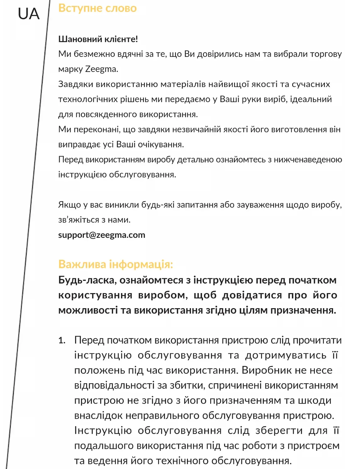 ze worden gebruikt. De aeeldingen dienen alleen ter illustrae, het werkelijke uiterlijk van de producten kan van het uiterlijk op de aeeldingen verschillen.UA Вступне слово Шановний клієнте! Ми безмежно вдячні за те, що Ви довірились нам та вибрали торгову марку Zeegma. Завдяки використанню матеріалів найвищої якості та сучасних технологічних рішень ми передаємо у Ваші руки виріб, ідеальний для повсякденного використання. Ми переконані, що завдяки незвичайній якості його виготовлення він виправдає усі Ваші очікування. Перед використанням виробу детально ознайомтесь з нижченаведеною інструкцією обслуговування. Якщо у вас виникли будь-які запитання або зауваження щодо виробу, зв’яжіться з нами. support@zeegma.com Важлива інформація: Будь-ласка, ознайомтеся з інструкцією перед початком користування виробом, щоб довідатися про його можливості та використання згідно цілям призначення.