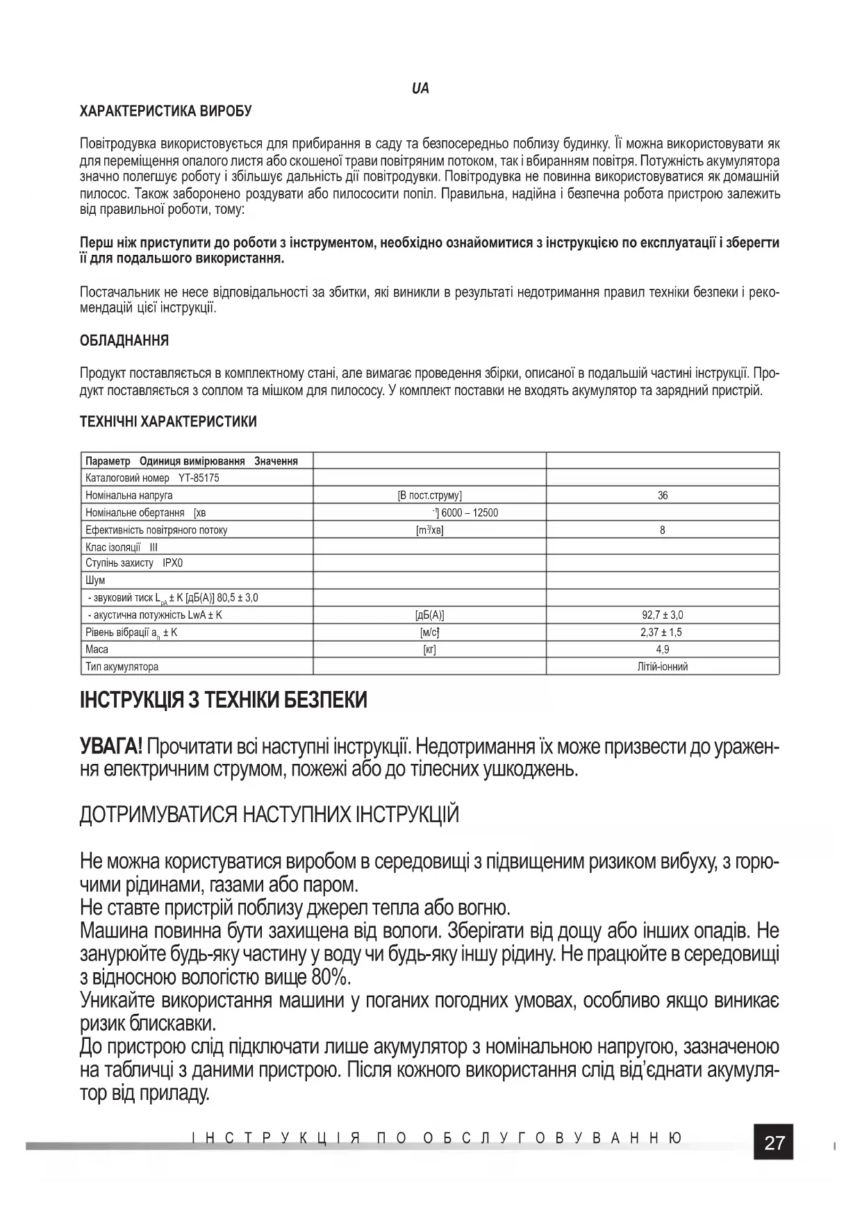 Продукт поставляється в комплектному стані, але вимагає проведення збірки, описаної в подальшій частині інструкції. Про- дукт поставляється з соплом та мішком для пилососу. У комплект поставки не входять акумулятор та зарядний пристрій. ТЕХНІЧНІ ХАРАКТЕРИСТИКИ Параметр Одиниця вимірювання Значення Каталоговий номер YT-85175 Номінальна напруга [В пост.струму]36 Номінальне обертання [хв