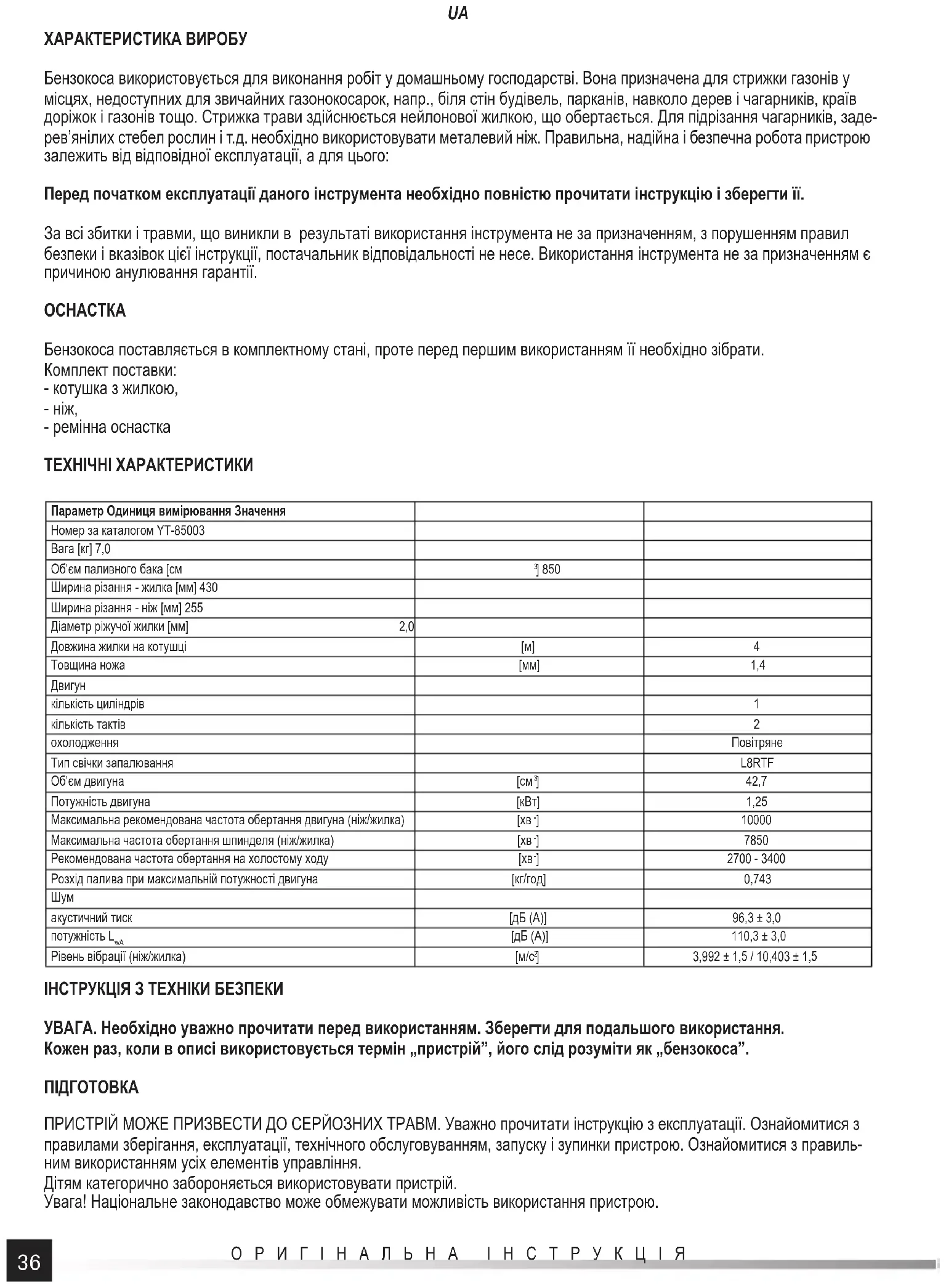 ] 3,992 ± 1,5 / 10,403 ± 1,5 ІНСТРУКЦІЯ З ТЕХНІКИ БЕЗПЕКИ УВАГА. Необхідно уважно прочитати перед використанням. Зберегти для подальшого використання. Кожен раз, коли в описі використовується термін „пристрій”, його слід розуміти як „бензокоса”.
