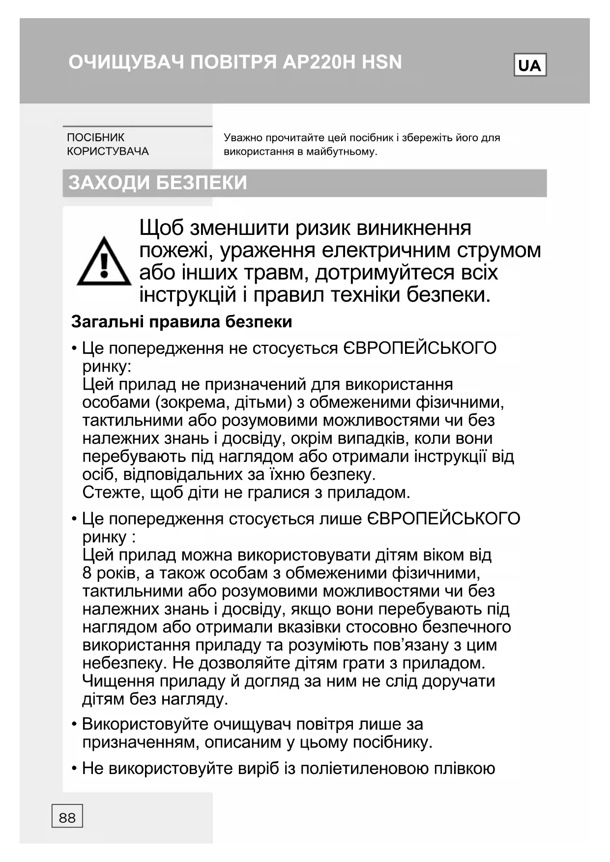 Цей прилад можна використовувати дітям віком від 8 років, а також особам з обмеженими фізичними, тактильними або розумовими можливостями чи без належних знань і досвіду, якщо вони перебувають під наглядом або отримали вказівки стосовно безпечного використання приладу та розуміють пов’язану з цим небезпеку. Не дозволяйте дітям грати з приладом. Чищення приладу й догляд за ним не слід доручати дітям без нагляду.