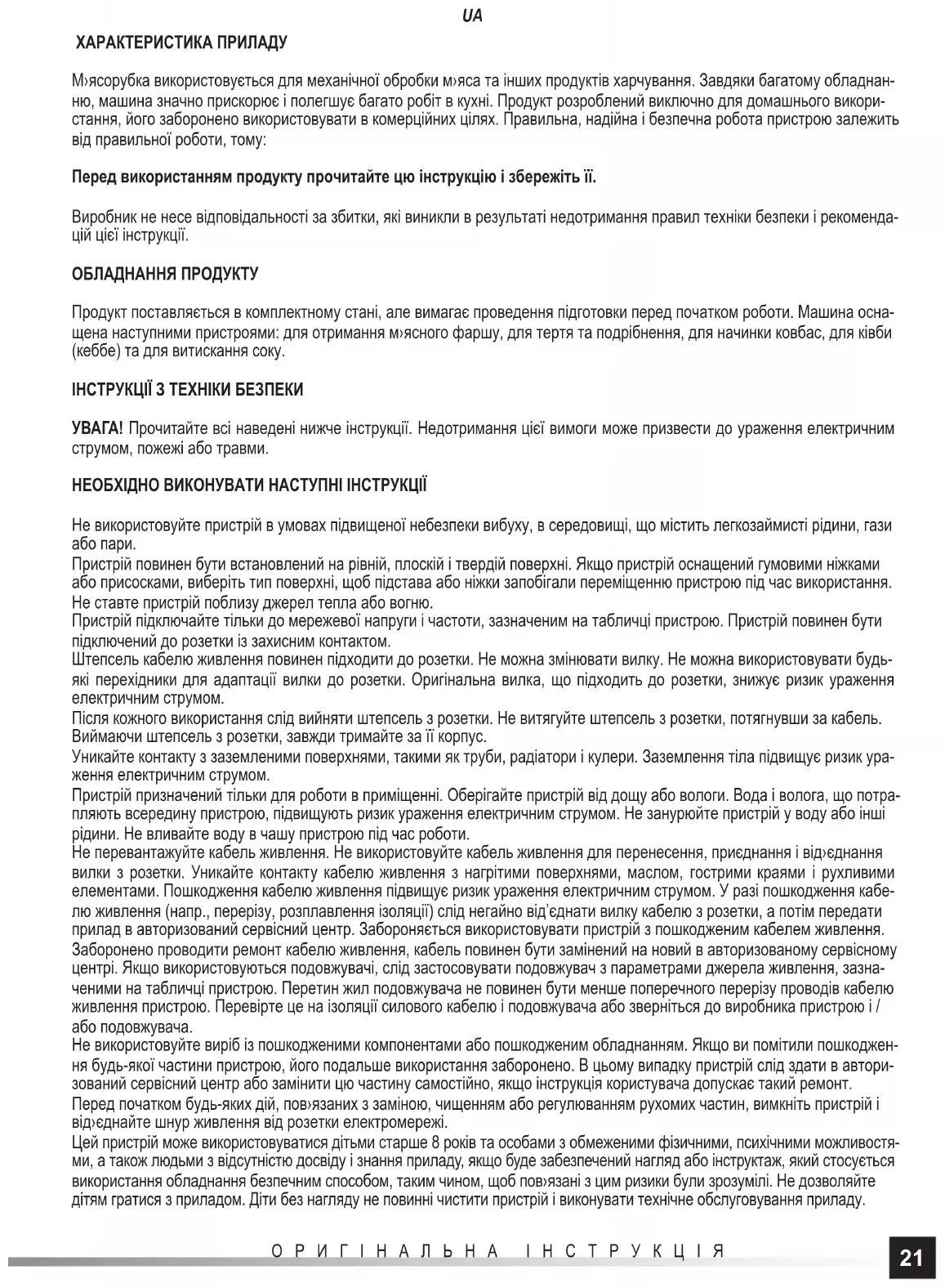 ХАРАКТЕРИСТИКА ПРИЛАДУ М›ясорубка використовується для механічної обробки м›яса та інших продуктів харчування. Завдяки багатому обладнан- ню, машина значно прискорює і полегшує багато робіт в кухні. Продукт розроблений виключно для домашнього викори- стання, його заборонено використовувати в комерційних цілях. Правильна, надійна і безпечна робота пристрою залежить від правильної роботи, тому: Перед використанням продукту прочитайте цю інструкцію і збережіть її. Виробник не несе відповідальності за збитки, які виникли в результаті недотримання правил техніки безпеки і рекоменда- цій цієї інструкції. ОБЛАДНАННЯ ПРОДУКТУ Продукт поставляється в комплектному стані, але вимагає проведення підготовки перед початком роботи. Машина осна- щена наступними пристроями: для отримання м›ясного фаршу, для тертя та подрібнення, для начинки ковбас, для ківби (кеббе) та для витискання соку. ІНСТРУКЦІЇ З ТЕХНІКИ БЕЗПЕКИ УВАГА! Прочитайте всі наведені нижче інструкції. Недотримання цієї вимоги може призвести до ураження електричним струмом, пожежі або травми. НЕОБХІДНО ВИКОНУВАТИ НАСТУПНІ ІНСТРУКЦІЇ Не використовуйте пристрій в умовах підвищеної небезпеки вибуху, в середовищі, що містить легкозаймисті рідини, гази