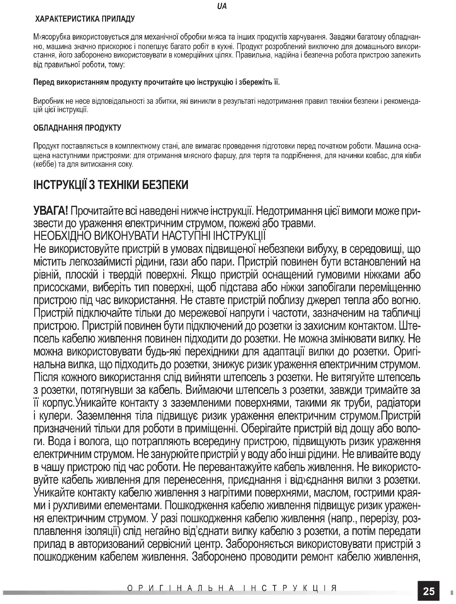 ХАРАКТЕРИСТИКА ПРИЛАДУ М›ясорубка використовується для механічної обробки м›яса та інших продуктів харчування. Завдяки багатому обладнан- ню, машина значно прискорює і полегшує багато робіт в кухні. Продукт розроблений виключно для домашнього викори- стання, його заборонено використовувати в комерційних цілях. Правильна, надійна і безпечна робота пристрою залежить від правильної роботи, тому: Перед використанням продукту прочитайте цю інструкцію і збережіть її. Виробник не несе відповідальності за збитки, які виникли в результаті недотримання правил техніки безпеки і рекоменда- цій цієї інструкції. ОБЛАДНАННЯ ПРОДУКТУ Продукт поставляється в комплектному стані, але вимагає проведення підготовки перед початком роботи. Машина осна- щена наступними пристроями: для отримання м›ясного фаршу, для тертя та подрібнення, для начинки ковбас, для ківби (кеббе) та для витискання соку. ІНСТРУКЦІЇ З ТЕХНІКИ БЕЗПЕКИ УВАГА! Прочитайте всі наведені нижче інструкції. Недотримання цієї вимоги може при- звести до ураження електричним струмом, пожежі або травми. НЕОБХІДНО ВИКОНУВАТИ НАСТУПНІ ІНСТРУКЦІЇ Не використовуйте пристрій в умовах підвищеної небезпеки вибуху, в середовищі, що містить легкозаймисті рідини, гази або пари. Пристрій повинен бути встановлений на рівній, плоскій і твердій поверхні. Якщо пристрій оснащений гумовими ніжками або присосками, виберіть тип поверхні, щоб підстава або ніжки запобігали переміщенню пристрою під час використання. Не ставте пристрій поблизу джерел тепла або вогню. Пристрій підключайте тільки до мережевої напруги і частоти, зазначеним на табличці пристрою. Пристрій повинен бути підключений до розетки із захисним контактом. Ште- псель кабелю живлення повинен підходити до розетки. Не можна змінювати вилку. Не можна використовувати будь-які перехідники для адаптації вилки до розетки. Оригі- нальна вилка, що підходить до розетки, знижує ризик ураження електричним струмом. Після кожного використання слід вийняти штепсель з розетки. Не витягуйте штепсель з розетки, потягнувши за кабель. Виймаючи штепсель з розетки, завжди тримайте за її корпус.Уникайте контакту з заземленими поверхнями, такими як труби, радіатори і кулери. Заземлення тіла підвищує ризик ураження електричним струмом.Пристрій призначений тільки для роботи в приміщенні. Оберігайте пристрій від дощу або воло- ги. Вода і волога, що потрапляють всередину пристрою, підвищують ризик ураження електричним струмом. Не занурюйте пристрій у воду або інші рідини. Не вливайте воду в чашу пристрою під час роботи. Не перевантажуйте кабель живлення. Не використо- вуйте кабель живлення для перенесення, приєднання і від›єднання вилки з розетки. Уникайте контакту кабелю живлення з нагрітими поверхнями, маслом, гострими края- ми і рухливими елементами. Пошкодження кабелю живлення підвищує ризик уражен- ня електричним струмом. У разі пошкодження кабелю живлення (напр., перерізу, роз- плавлення ізоляції) слід негайно від’єднати вилку кабелю з розетки, а потім передати прилад в авторизований сервісний центр. Забороняється використовувати пристрій з пошкодженим кабелем живлення. Заборонено проводити ремонт кабелю живлення,26 ОРИГІНАЛЬНА ІНСТРУКЦІЯ