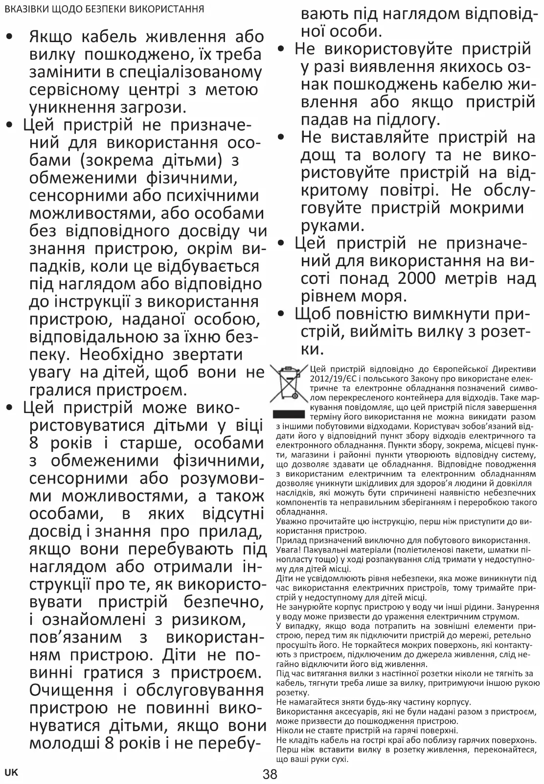 Цей пристрій відповідно до Європейської Директиви 2012/19/ЄС і польського Закону про використане елек- тричне та електронне обладнання позначений симво- лом перекресленого контейнера для відходів. Таке мар- кування повідомляє, що цей пристрій після завершення терміну його використання не можна викидати разом з іншими побутовими відходами. Користувач зобов’язаний від- дати його у відповідний пункт збору відходів електричного та електронного обладнання. Пункти збору, зокрема, місцеві пунк- ти, магазини і районні пункти утворюють відповідну систему, що дозволяє здавати це обладнання. Відповідне поводження з використаним електричним та електронним обладнанням дозволяє уникнути шкідливих для здоров’я людини й довкілля наслідків, які можуть бути спричинені наявністю небезпечних компонентів та неправильним зберіганням і переробкою такого обладнання. Уважно прочитайте цю інструкцію, перш ніж приступити до ви- користання пристрою. Прилад призначений виключно для побутового використання. Увага! Пакувальні матеріали (поліетиленові пакети, шматки пі- нопласту тощо) у ході розпакування слід тримати у недоступно- му для дітей місці. Діти не усвідомлюють рівня небезпеки, яка може виникнути під час використання електричних пристроїв, тому тримайте при- стрій у недоступному для дітей місці. Не занурюйте корпус пристрою у воду чи інші рідини. Занурення у воду може призвести до ураження електричним струмом. У випадку, якщо вода потрапить на зовнішні елементи при- строю, перед тим як підключити пристрій до мережі, ретельно просушіть його. Не торкайтеся мокрих поверхонь, які контакту- ють з пристроєм, підключеним до джерела живлення, слід не- гайно відключити його від живлення. Під час витягання вилки з настінної розетки ніколи не тягніть за кабель, тягнути треба лише за вилку, притримуючи іншою рукою