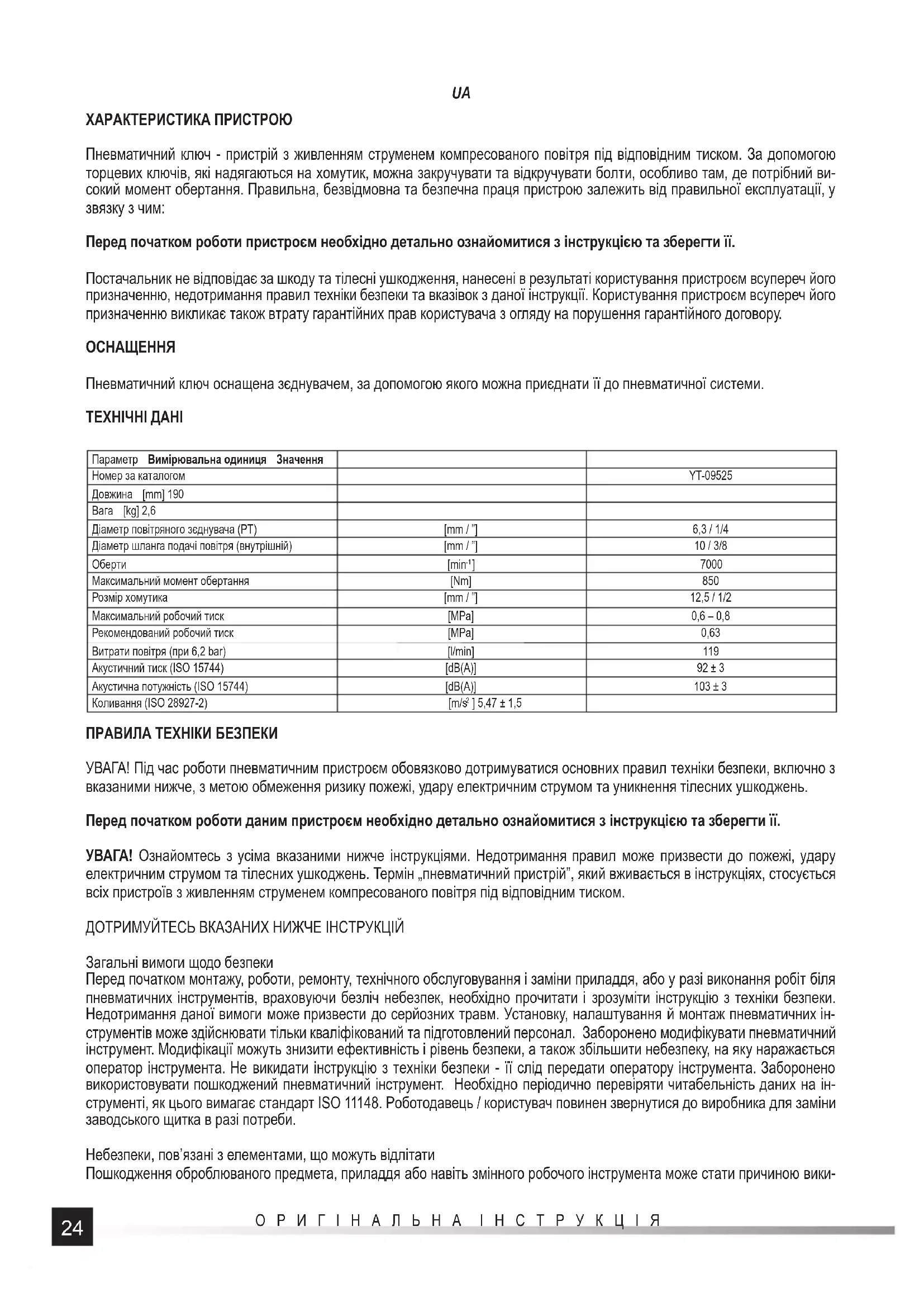 ] 5,47 ± 1,5 ПРАВИЛА ТЕХНІКИ БЕЗПЕКИ УВАГА! Під час роботи пневматичним пристроєм обовязково дотримуватися основних правил техніки безпеки, включно з вказаними нижче, з метою обмеження ризику пожежі, удару електричним струмом та уникнення тілесних ушкоджень. Перед початком роботи даним пристроєм необхідно детально ознайомитися з інструкцією та зберегти її. УВАГА! Ознайомтесь з усіма вказаними нижче інструкціями. Недотримання правил може призвести до пожежі, удару електричним струмом та тілесних ушкоджень. Термін „пневматичний пристрій”, який вживається в інструкціях, стосується всіх пристроїв з живленням струменем компресованого повітря під відповідним тиском. ДОТРИМУЙТЕСЬ ВКАЗАНИХ НИЖЧЕ ІНСТРУКЦІЙ Загальні вимоги щодо безпеки Перед початком монтажу, роботи, ремонту, технічного обслуговування і заміни приладдя, або у разі виконання робіт біля пневматичних інструментів, враховуючи безліч небезпек, необхідно прочитати і зрозуміти інструкцію з техніки безпеки. Недотримання даної вимоги може призвести до серйозних травм. Установку, налаштування й монтаж пневматичних ін- струментів може здійснювати тільки кваліфікований та підготовлений персонал. Заборонено модифікувати пневматичний інструмент. Модифікації можуть знизити ефективність і рівень безпеки, а також збільшити небезпеку, на яку наражається оператор інструмента. Не викидати інструкцію з техніки безпеки - її слід передати оператору інструмента. Заборонено використовувати пошкоджений пневматичний інструмент. Необхідно періодично перевіряти читабельність даних на ін- струменті, як цього вимагає стандарт ISO 11148. Роботодавець / користувач повинен звернутися до виробника для заміни заводського щитка в разі потреби. Небезпеки, пов’язані з елементами, що можуть відлітати Пошкодження оброблюваного предмета, приладдя або навіть змінного робочого інструмента може стати причиною вики-25 ОРИГІНАЛЬНА ІНСТРУКЦІЯ
