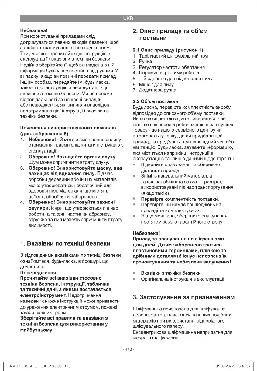 Шліфмашина призначена для шліфування дерева, заліза, пластмаси та інших подібних матеріалів при використанні відповідного шліфувального паперу. Ексцентрикова шліфмашина непридатна для мокрого шліфування. Anl_TC_RS_425_E_SPK13.indb 173Anl_TC_RS_425_E_SPK13.indb 173 31.03.2022 08:46:3731.03.2022 08:46:37UKR