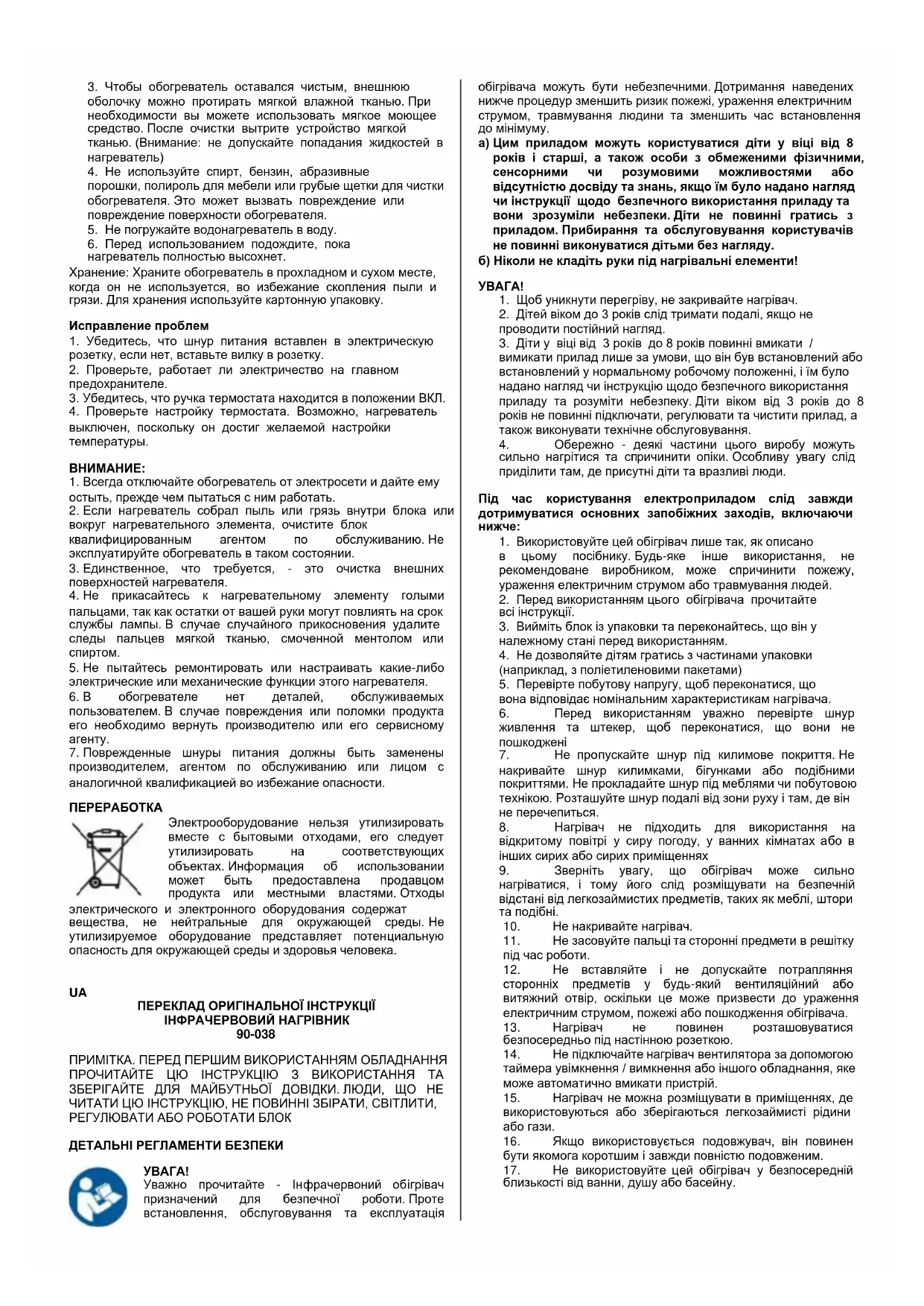 ПЕРЕКЛАД ОРИГІНАЛЬНОЇ ІНСТРУКЦІЇ ІНФРАЧЕРВОВИЙ НАГРІВНИК 90-038 ПРИМІТКА. ПЕРЕД ПЕРШИМ ВИКОРИСТАННЯМ ОБЛАДНАННЯ ПРОЧИТАЙТЕ ЦЮ ІНСТРУКЦІЮ З ВИКОРИСТАННЯ ТА ЗБЕРІГАЙТЕ ДЛЯ МАЙБУТНЬОЇ ДОВІДКИ. ЛЮДИ, ЩО НЕ ЧИТАТИ ЦЮ ІНСТРУКЦІЮ, НЕ ПОВИННІ ЗБІРАТИ, СВІТЛИТИ, РЕГУЛЮВАТИ АБО РОБОТАТИ БЛОК ДЕТАЛЬНІ РЕГЛАМЕНТИ БЕЗПЕКИ