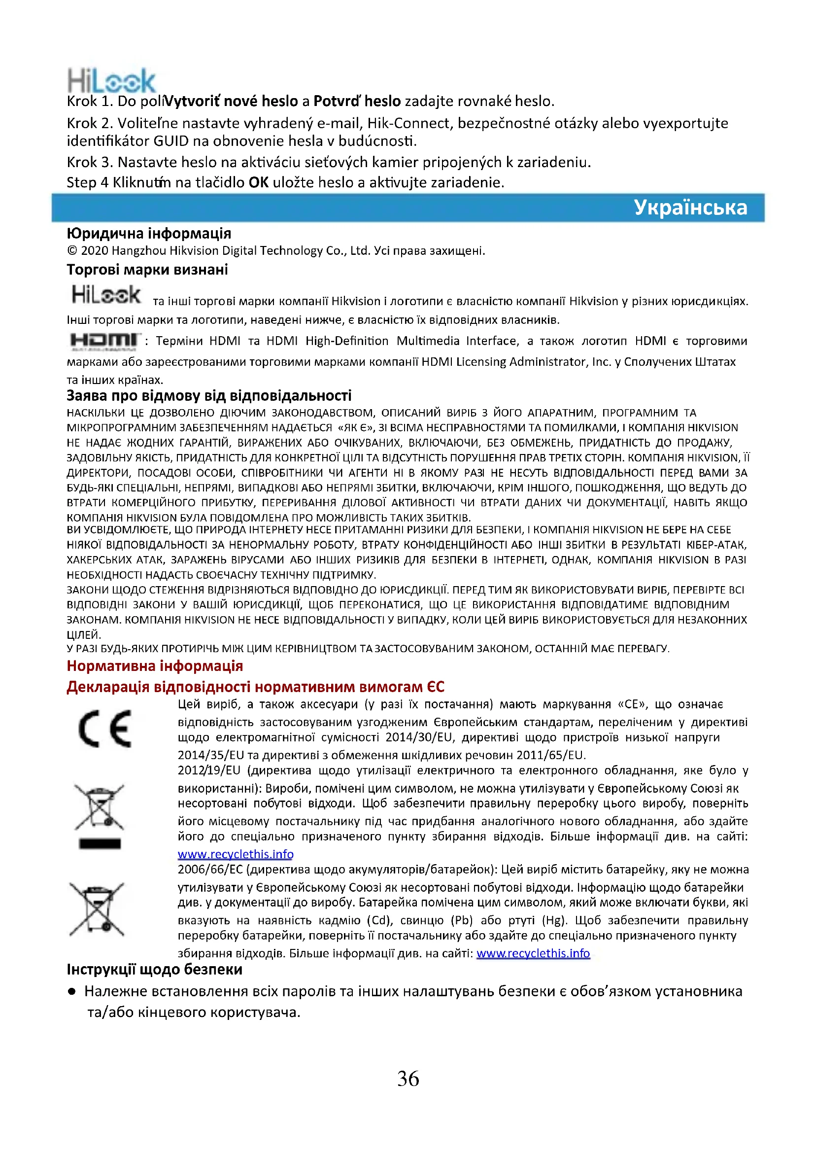 Юридична інформація © 2020 Hangzhou Hikvision Digital Technology Co., Ltd. Усі права захищені. Торгові марки визнані та інші торгові марки компанії Hikvision і логотипи є власністю компанії Hikvision у різних юрисдикціях. Інші торгові марки та логотипи, наведені нижче, є власністю їх відповідних власників. : Терміни HDMI та HDMI High-Definition Multimedia Interface, а також логотип HDMI є торговими марками або зареєстрованими торговими марками компанії HDMI Licensing Administrator, Inc. у Сполучених Штатах та інших країнах. Заява про відмову від відповідальності НАСКІЛЬКИ ЦЕ ДОЗВОЛЕНО ДІЮЧИМ ЗАКОНОДАВСТВОМ, ОПИСАНИЙ ВИРІБ З ЙОГО АПАРАТНИМ, ПРОГРАМНИМ ТА МІКРОПРОГРАМНИМ ЗАБЕЗПЕЧЕННЯМ НАДАЄТЬСЯ «ЯК Є», ЗІ ВСІМА НЕСПРАВНОСТЯМИ ТА ПОМИЛКАМИ, І КОМПАНІЯ HIKVISION НЕ НАДАЄ ЖОДНИХ ГАРАНТІЙ, ВИРАЖЕНИХ АБО ОЧІКУВАНИХ, ВКЛЮЧАЮЧИ, БЕЗ ОБМЕЖЕНЬ, ПРИДАТНІСТЬ ДО ПРОДАЖУ, ЗАДОВІЛЬНУ ЯКІСТЬ, ПРИДАТНІСТЬ ДЛЯ КОНКРЕТНОЇ ЦІЛІ ТА ВІДСУТНІСТЬ ПОРУШЕННЯ ПРАВ ТРЕТІХ СТОРІН. КОМПАНІЯ HIKVISION, ЇЇ ДИРЕКТОРИ, ПОСАДОВІ ОСОБИ, СПІВРОБІТНИКИ ЧИ АГЕНТИ НІ В ЯКОМУ РАЗІ НЕ НЕСУТЬ ВІДПОВІДАЛЬНОСТІ ПЕРЕД ВАМИ ЗА БУДЬ-ЯКІ СПЕЦІАЛЬНІ, НЕПРЯМІ, ВИПАДКОВІ АБО НЕПРЯМІ ЗБИТКИ, ВКЛЮЧАЮЧИ, КРІМ ІНШОГО, ПОШКОДЖЕННЯ, ЩО ВЕДУТЬ ДО ВТРАТИ КОМЕРЦІЙНОГО ПРИБУТКУ, ПЕРЕРИВАННЯ ДІЛОВОЇ АКТИВНОСТІ ЧИ ВТРАТИ ДАНИХ ЧИ ДОКУМЕНТАЦІЇ, НАВІТЬ ЯКЩО КОМПАНІЯ HIKVISION БУЛА ПОВІДОМЛЕНА ПРО МОЖЛИВІСТЬ ТАКИХ ЗБИТКІВ. ВИ УСВІДОМЛЮЄТЕ, ЩО ПРИРОДА ІНТЕРНЕТУ НЕСЕ ПРИТАМАННІ РИЗИКИ ДЛЯ БЕЗПЕКИ, І КОМПАНІЯ HIKVISION НЕ БЕРЕ НА СЕБЕ НІЯКОЇ ВІДПОВІДАЛЬНОСТІ ЗА НЕНОРМАЛЬНУ РОБОТУ, ВТРАТУ КОНФІДЕНЦІЙНОСТІ АБО ІНШІ ЗБИТКИ В РЕЗУЛЬТАТІ КІБЕР-АТАК, ХАКЕРСЬКИХ АТАК, ЗАРАЖЕНЬ ВІРУСАМИ АБО ІНШИХ РИЗИКІВ ДЛЯ БЕЗПЕКИ В ІНТЕРНЕТІ, ОДНАК, КОМПАНІЯ HIKVISION В РАЗІ НЕОБХІДНОСТІ НАДАСТЬ СВОЄЧАСНУ ТЕХНІЧНУ ПІДТРИМКУ. ЗАКОНИ ЩОДО СТЕЖЕННЯ ВІДРІЗНЯЮТЬСЯ ВІДПОВІДНО ДО ЮРИСДИКЦІЇ. ПЕРЕД ТИМ ЯК ВИКОРИСТОВУВАТИ ВИРІБ, ПЕРЕВІРТЕ ВСІ ВІДПОВІДНІ ЗАКОНИ У ВАШІЙ ЮРИСДИКЦІЇ, ЩОБ ПЕРЕКОНАТИСЯ, ЩО ЦЕ ВИКОРИСТАННЯ ВІДПОВІДАТИМЕ ВІДПОВІДНИМ ЗАКОНАМ. КОМПАНІЯ HIKVISION НЕ НЕСЕ ВІДПОВІДАЛЬНОСТІ У ВИПАДКУ, КОЛИ ЦЕЙ ВИРІБ ВИКОРИСТОВУЄТЬСЯ ДЛЯ НЕЗАКОННИХ У РАЗІ БУДЬ-ЯКИХ ПРОТИРІЧЬ МІЖ ЦИМ КЕРІВНИЦТВОМ ТА ЗАСТОСОВУВАНИМ ЗАКОНОМ, ОСТАННІЙ МАЄ ПЕРЕВАГУ. Нормативна інформація Декларація відповідності нормативним вимогам ЄС