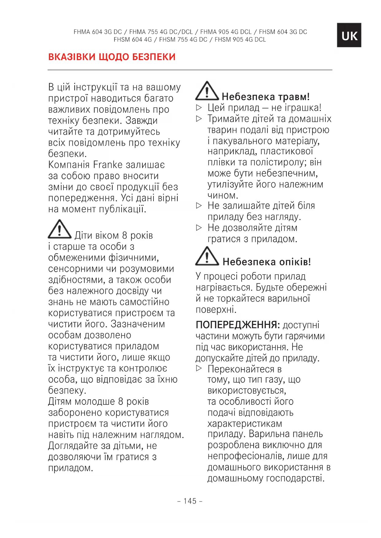 Переконайтеся в тому, що тип газу, що використовується, та особливості його подачі відповідають характеристикам приладу. Варильна панель розроблена виключно для непрофесіоналів, лише для домашнього використання в домашньому господарстві.FHMA 604 3G DC / FHMA 755 4G DC/DCL / FHMA 905 4G DCL / FHSM 604 3G DC FHSM 604 4G / FHSM 755 4G DC / FHSM 905 4G DCL – 146 –