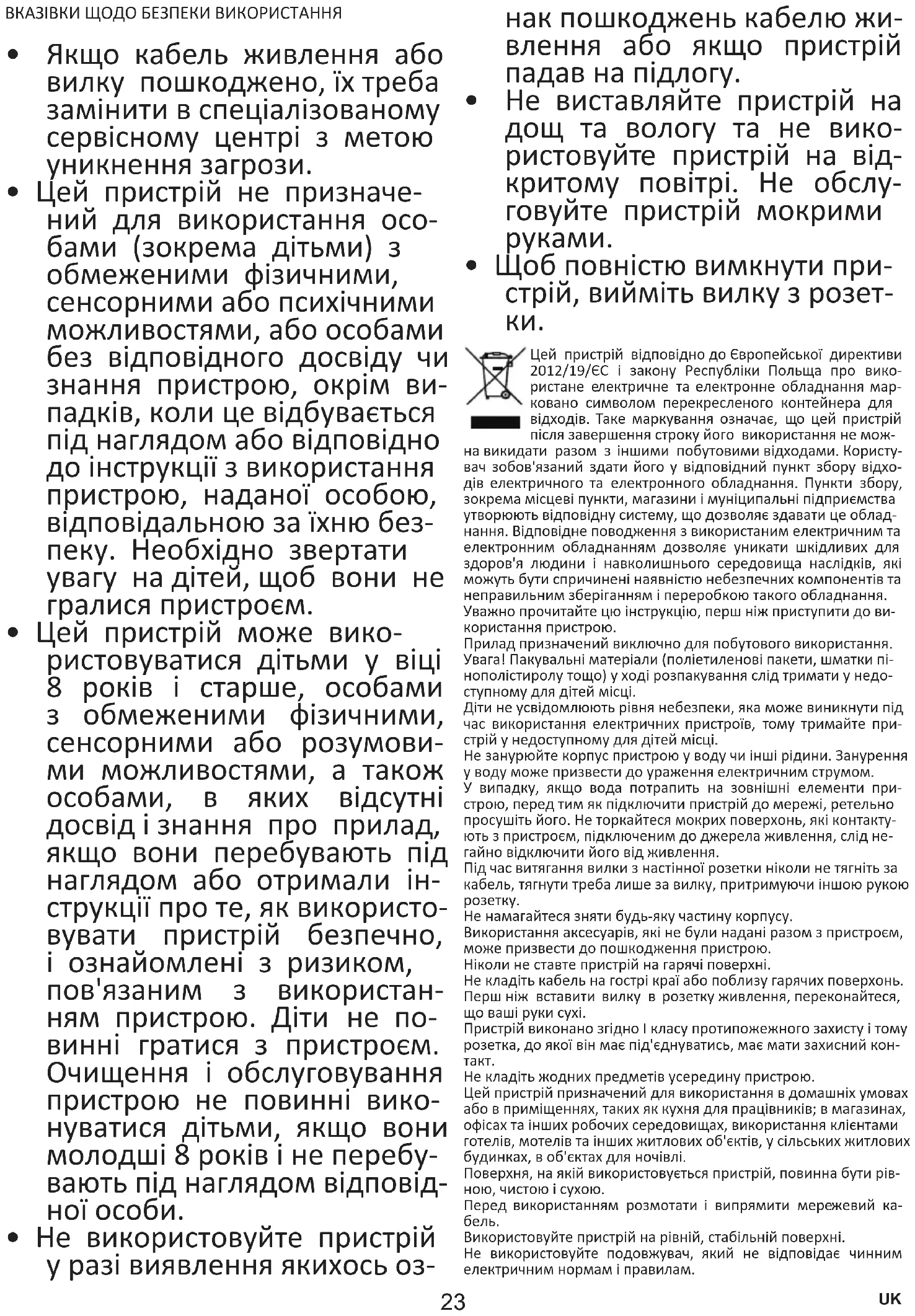 Цей пристрій відповідно до Європейської директиви 2012/19/ЄС і закону Республіки Польща про вико- ристане електричне та електронне обладнання мар- ковано символом перекресленого контейнера для відходів. Таке маркування означає, що цей пристрій після завершення строку його використання не мож- на викидати разом з іншими побутовими відходами. Користу- вач зобов'язаний здати його у відповідний пункт збору відхо- дів електричного та електронного обладнання. Пункти збору, зокрема місцеві пункти, магазини і муніципальні підприємства утворюють відповідну систему, що дозволяє здавати це облад- нання. Відповідне поводження з використаним електричним та електронним обладнанням дозволяє уникати шкідливих для здоров'я людини і навколишнього середовища наслідків, які можуть бути спричинені наявністю небезпечних компонентів та неправильним зберіганням і переробкою такого обладнання. Уважно прочитайте цю інструкцію, перш ніж приступити до ви- користання пристрою. Прилад призначений виключно для побутового використання. Увага! Пакувальні матеріали (поліетиленові пакети, шматки пі- нополістиролу тощо) у ході розпакування слід тримати у недо- ступному для дітей місці. Діти не усвідомлюють рівня небезпеки, яка може виникнути під час використання електричних пристроїв, тому тримайте при- стрій у недоступному для дітей місці. Не занурюйте корпус пристрою у воду чи інші рідини. Занурення у воду може призвести до ураження електричним струмом. У випадку, якщо вода потрапить на зовнішні елементи при- строю, перед тим як підключити пристрій до мережі, ретельно просушіть його. Не торкайтеся мокрих поверхонь, які контакту- ють з пристроєм, підключеним до джерела живлення, слід не- гайно відключити його від живлення. Під час витягання вилки з настінної розетки ніколи не тягніть за кабель, тягнути треба лише за вилку, притримуючи іншою рукою