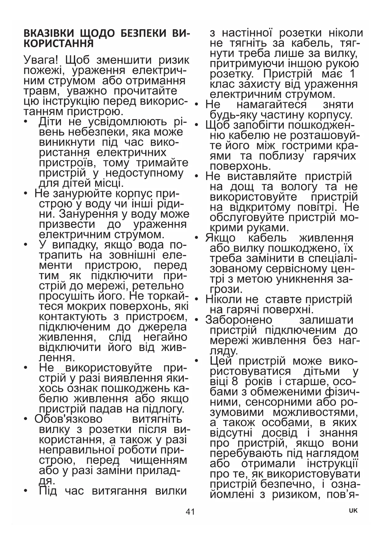 - Під час витягання вилки з настінної розетки ніколи не тягніть за кабель, тяг- нути треба лише за вилку, притримуючи іншою рукою розетку. Пристрій має 1 клас захисту від ураження електричним струмом.