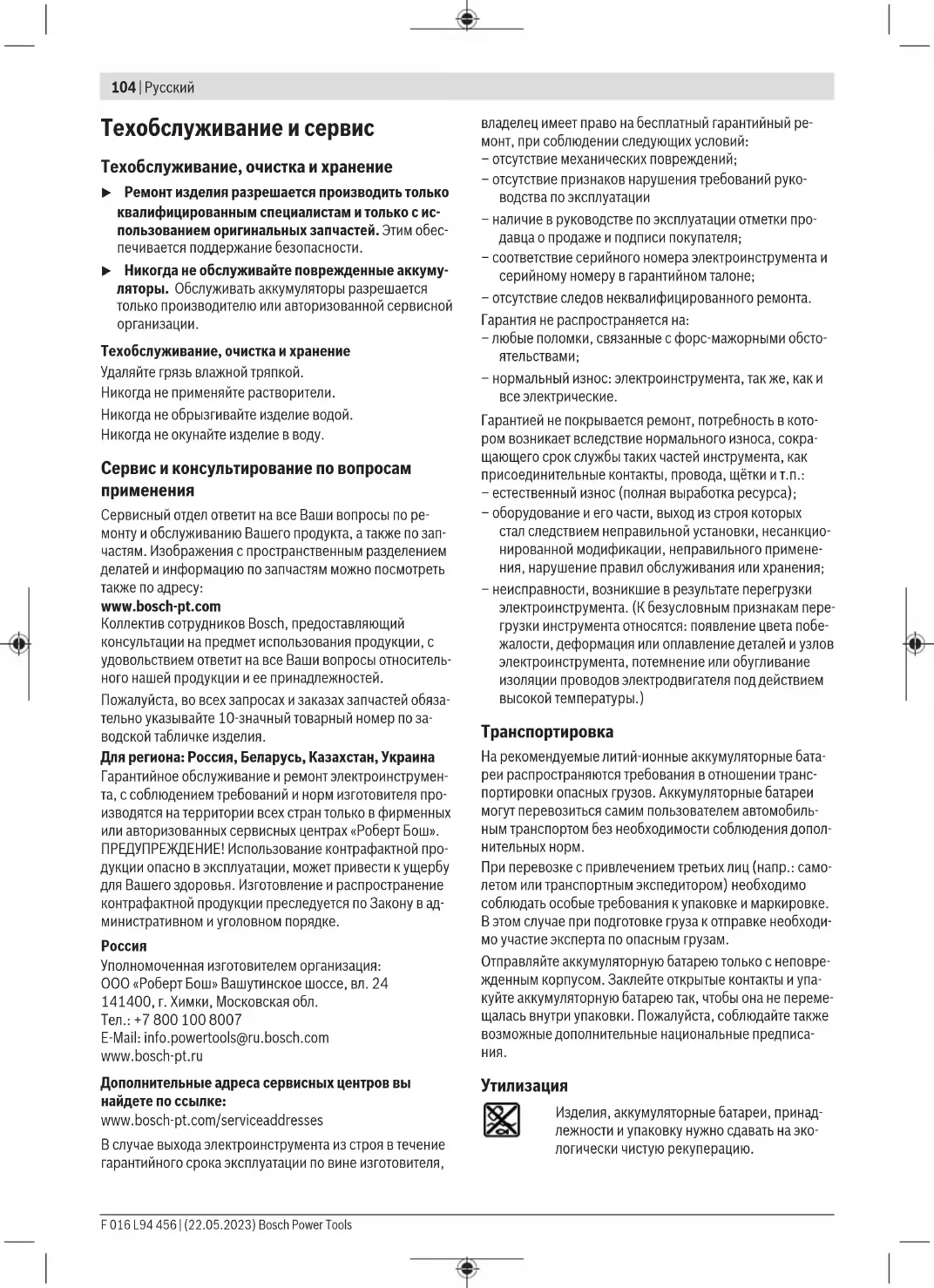 Бош Сервісний Центр електроінструментів вул. Крайня 1 02660 Київ 60 Тел.: +380 44 490 2407 Факс: +380 44 512 0591 E-Mail: pt-service@ua.bosch.com www.bosch-professional.com/ua/uk Адреса Регіональних гарантійних сервісних майстерень за- значена в Національному гарантійному талоні. Адреси інших сервісних центрів наведено нижче: www.bosch-pt.com/serviceaddresses Транспортування На рекомендовані літієво-іонні акумуляторні батареї розповсюджуються вимоги щодо транспортування небезпечних вантажів. Акумуляторні батареї можуть перевозитися користувачем автомобільним транспортом без потреби дотримання додаткових норм. При пересилці третіми особами (напр.: повітряним транспортом або транспортним експедитором) потрібно додержуватися особливих вимог щодо упаковки та F 016 L94 456 | (22.05.2023) Bosch Power ToolsҚазақ | 111 маркування. У цьому випадку у підготовці посилки повинен брати участь експерт з небезпечних вантажів. Відсилайте акумуляторну батарею лише з непошкодженим корпусом. Заклейте відкриті контакти та запакуйте акумуляторну батарею так, щоб вона не совалася в упаковці. Дотримуйтеся, будь ласка, також можливих додаткових національних приписів.
