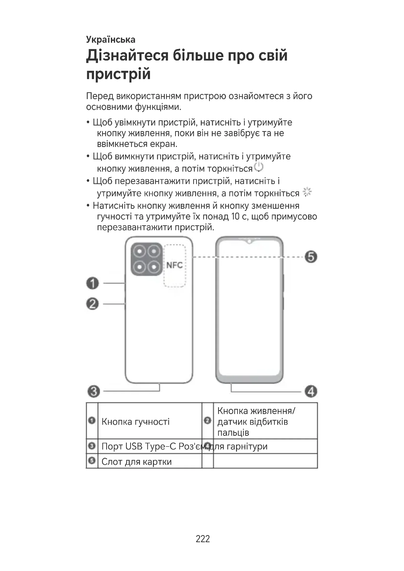 Порт USB Type-C Роз'єм для гарнітури Слот для картки 222• При використанні функції NFC утримуйте область NFC близько до інших пристроїв або