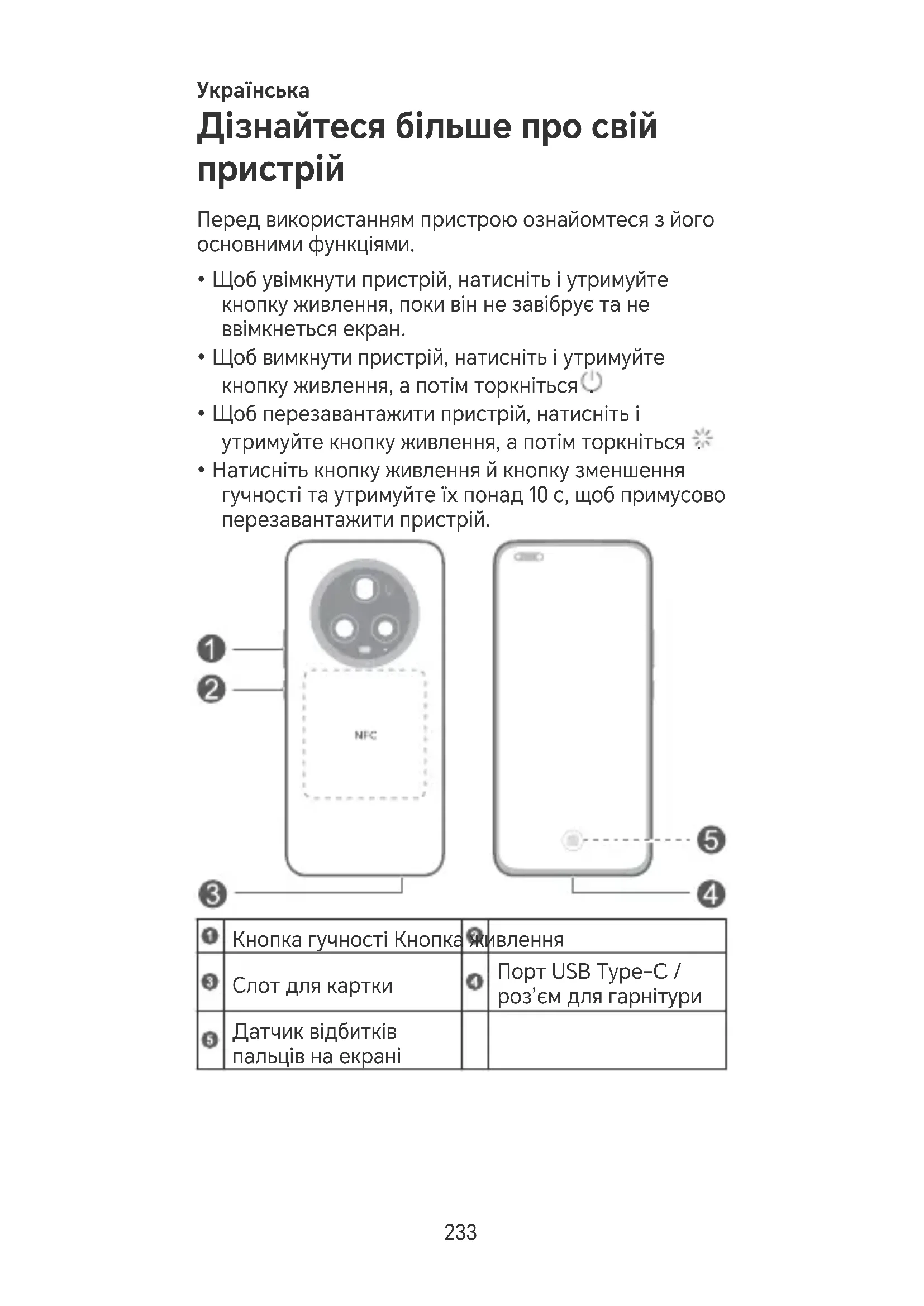 - Натисніть кнопку живлення й кнопку зменшення гучності та утримуйте їх понад 10 с, щоб примусово перезавантажити пристрій. Кнопка гучності Кнопка живлення Слот для картки Порт USB Type-C / роз’єм для гарнітури Датчик відбитків пальців на екрані 233• При використанні функції NFC утримуйте область NFC близько до інших пристроїв або