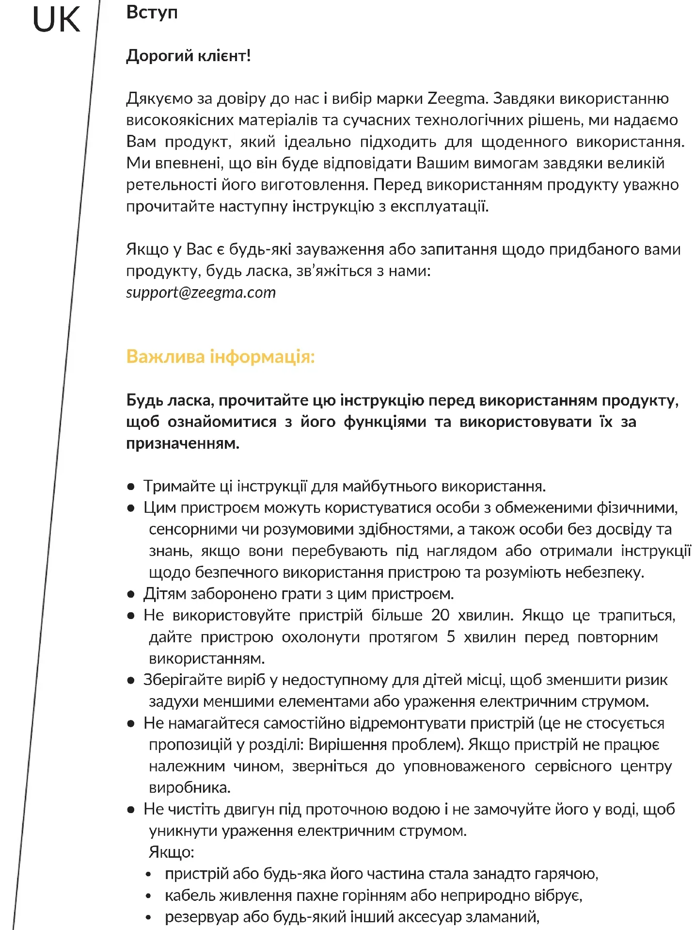 Дорогий клієнт! Дякуємо за довіру до нас i вибір марки Zeegma. Завдяки використанню високоякісних матеріалів та сучасних технологічних рішень, ми надаємо Вам продукт, який ідеально підходить для щоденного використання. Ми впевнені, що він буде відповідати Вашим вимогам завдяки великій ретельності його виготовлення. Перед використанням продукту уважно прочитайте наступну інструкцію з експлуатації. Якщо у Вас є будь-які зауваження або запитання щодо придбаного вами продукту, будь ласка, зв’яжіться з нами: support@zeegma.com Важлива інформація: Будь ласка, прочитайте цю інструкцію перед використанням продукту, щоб ознайомитися з його функціями та використовувати їх за призначенням.