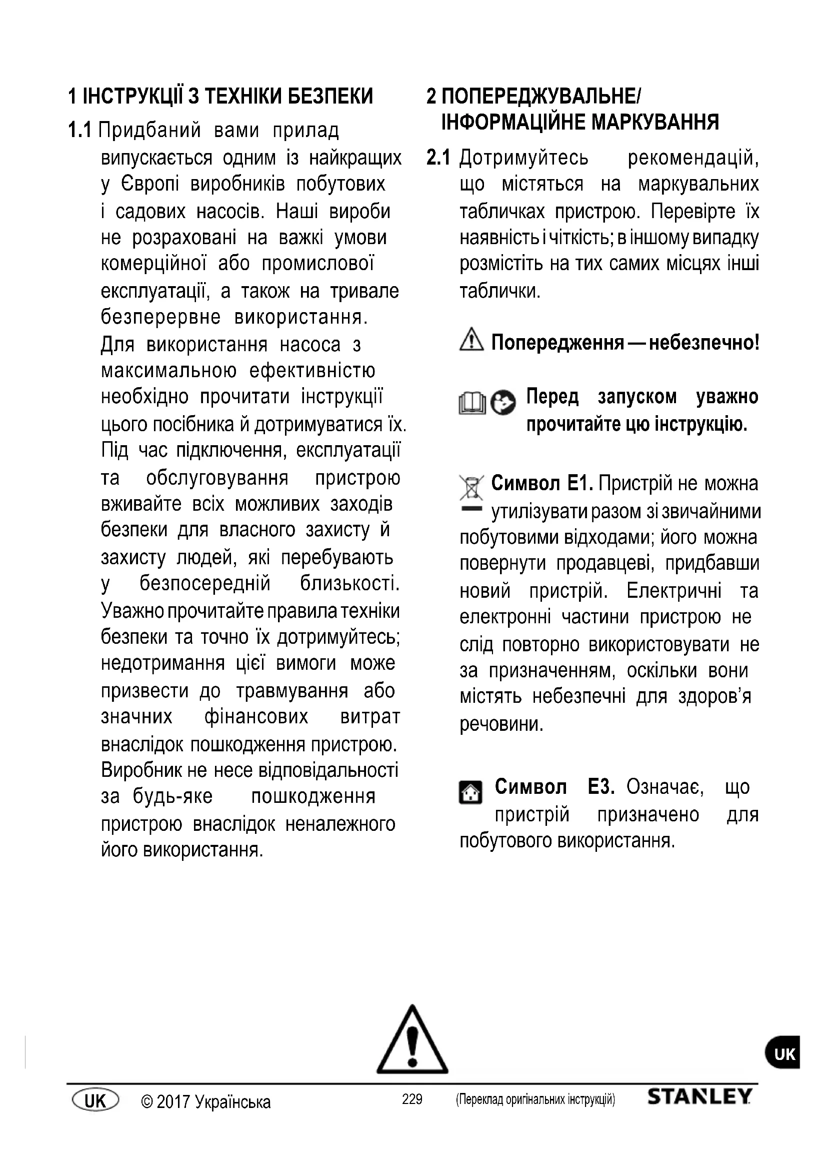 Символ E3. Означає, що пристрій призначено для побутового використання.230 231 (Переклад оригінальних інструкцій) © 2017 Українська (Переклад оригінальних інструкцій) © 2017 Українська