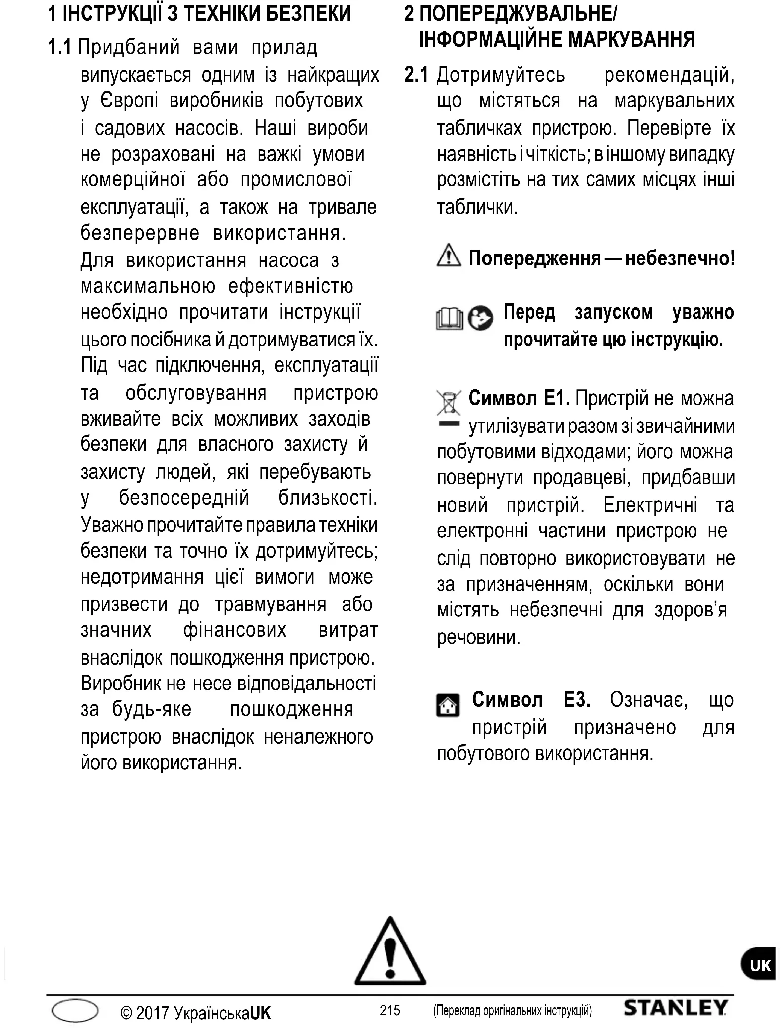 Символ E3. Означає, що пристрій призначено для побутового використання.216 217 (Переклад оригінальних інструкцій) © 2017 Українська (Переклад оригінальних інструкцій) © 2017 УкраїнськаUK