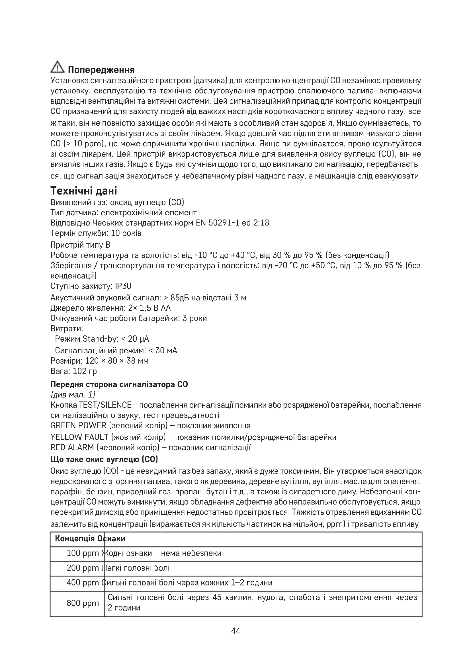 Режим Stand-by: < 20 µA Сигналізаційний режим: < 30 мA Розміри: 120 × 80 × 38 мм Вага: 102 гр Передня сторона сигналізатора CO (див мал. 1) Кнопка TEST/SILENCE – послаблення сигналізації помилки або розрядженої батарейки, послаблення сигналізаційного звуку, тест працездатності GREEN POWER (зелений колір) – показник живлення YELLOW FAULT (жовтий колір) – показник помилки/розрядженої батарейки RED ALARM (червоний колір) – показник сигналізації Що таке окис вуглецю (CO) Окис вуглецю (СО) - це невидимий газ без запаху, який є дуже токсичним. Він утворюється внаслідок недосконалого згоряння палива, такого як деревина, деревне вугілля, вугілля, масла для опалення, парафін, бензин, природний газ, пропан, бутан і т.д., а також із сигаретного диму. Небезпечні кон- центрації СО можуть виникнути, якщо обладнання дефектне або неправильно обслуговується, якщо перекритий димохід або приміщення недостатньо провітрюється. Тяжкість отравлення вдиханням СО залежить від концентрації (виражається як кількість частинок на мільйон, ppm) і тривалість впливу. Концепція Оснаки 100 ppm Жодні ознаки – нема небезпеки 200 ppm Легкі головні болі 400 ppm Сильні головні болі через кожних 1–2 години 800 ppm Сильні головні болі через 45 хвилин, нудота, слабота і знепритомлення через 2 години45 Концепція Оснаки 1 000 ppm Небезпечна концентрація – знепритомлення через 1 годину 1 600 ppm Нудота, сильні головні болі і запаморочення через 20 хвилин 3 200 ppm Нудота, сильні головні болі і запаморочення через 5–10 хвилин, знепритомлення після 30 хвилин 6 400 ppm Сильні головні болі і запаморочення через 1–2 хвилини, після 10–15 хвилин знепритомлення 12 800 ppm Негайне знепритомлення, небезпека смерть після 1–2 хвилин Щодо симптомів отруєння СО повинні бути проінформовані всі особи, які перебувають в приміщені! Пристрій, що контролює концентрацію CO активує сигналізацію, якщо на протязі даного періоду він виявляє певну концентрацію CO: Концентрація CO в одиницях ppm Вмиканнясигналізації ≥ 30 120 мін ≥ 50 від 60 до 90 мін ≥ 100 від 10 до 40 мін ≥ 300 до 3 мін