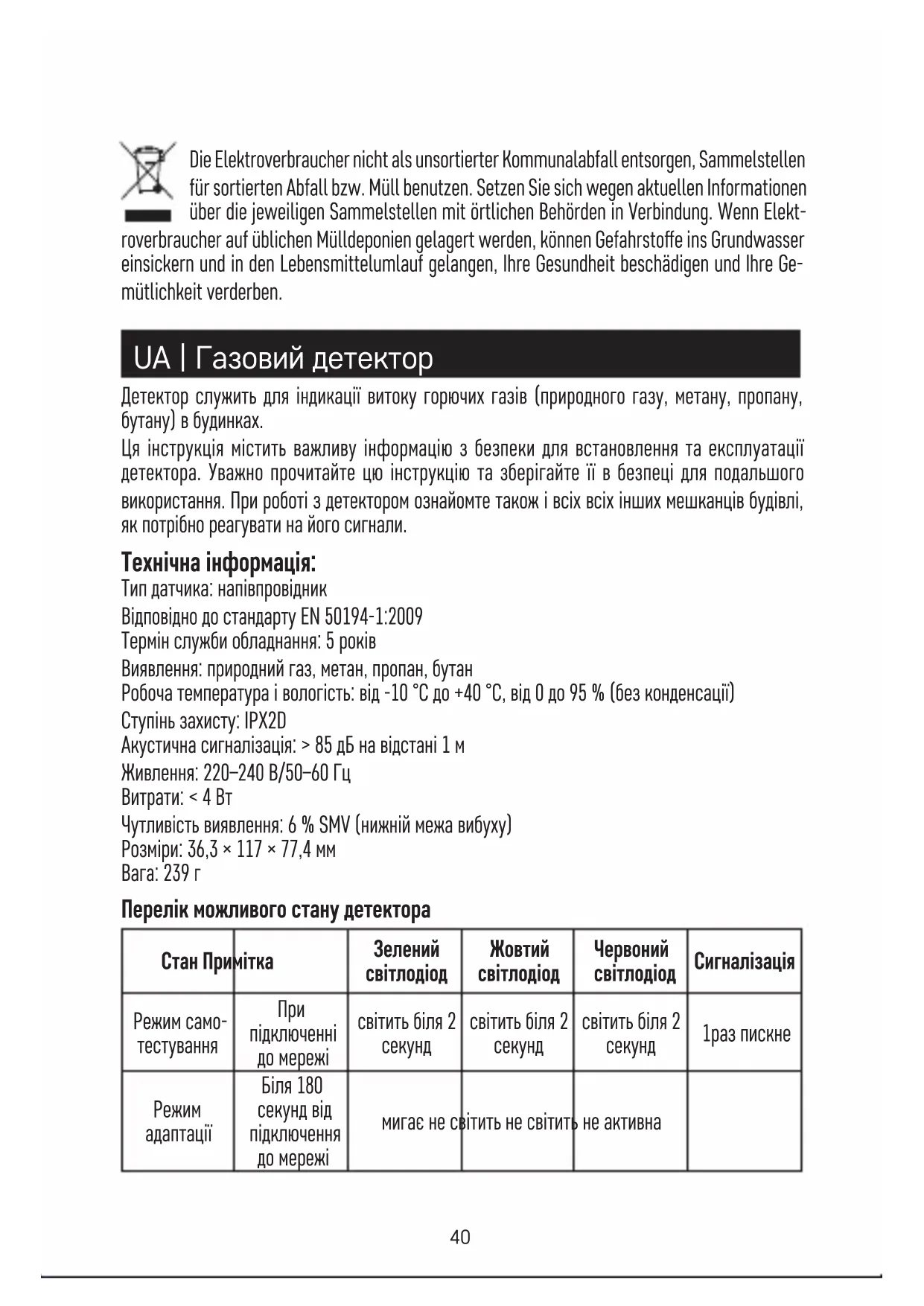 - Dieses Gerät ist nicht zur Verwendung durch Personen vorgesehen (Kinder eingeschlossen), die verminderte körperliche, sensorielle oder geistige Fähigkeiten haben oder nicht über ausreichende Erfahrung und Kenntnisse verfügen, außer sie haben von einer Person, die für ihre Sicherheit verantwortlich ist, Anweisungen für den Gebrauch des Geräts erhalten oder werden von dieser beaufsichtigt. Kinder müssen beaufsichtigt werden, um sicher zu gehen, dass sie nicht mit dem Gerät spielen.40 Die Elektroverbraucher nicht als unsortierter Kommunalabfall entsorgen, Sammelstellen für sortierten Abfall bzw. Müll benutzen. Setzen Sie sich wegen aktuellen Informationen über die jeweiligen Sammelstellen mit örtlichen Behörden in Verbindung. Wenn Elekt- roverbraucher auf üblichen Mülldeponien gelagert werden, können Gefahrstoe ins Grundwasser einsickern und in den Lebensmittelumlauf gelangen, Ihre Gesundheit beschädigen und Ihre Ge- mütlichkeit verderben. UA | Газовий детектор Детектор служить для індикації витоку горючих газів (природного газу, метану, пропану, бутану) в будинках. Ця інструкція містить важливу інформацію з безпеки для встановлення та експлуатації детектора. Уважно прочитайте цю інструкцію та зберігайте її в безпеці для подальшого використання. При роботі з детектором ознайомте також і всіх всіх інших мешканців будівлі, як потрібно реагувати на його сигнали. Технічна інформація: Тип датчика: напівпровідник Відповідно до стандарту EN 50194-1:2009 Термін служби обладнання: 5 років Виявлення: природний газ, метан, пропан, бутан Робоча температура і вологість: від -10 °C до +40 °C, від 0 до 95 % (без конденсації) Ступінь захисту: IPX2D Акустична сигналізація: > 85 дБ на відстані 1 м Живлення: 220–240 В/50–60 Гц Витрати: < 4 Вт Чутливість виявлення: 6 % SMV (нижній межа вибуху) Розміри: 36,3 × 117 × 77,4 мм Вага: 239 г Перелік можливого стану детектора Стан Примітка