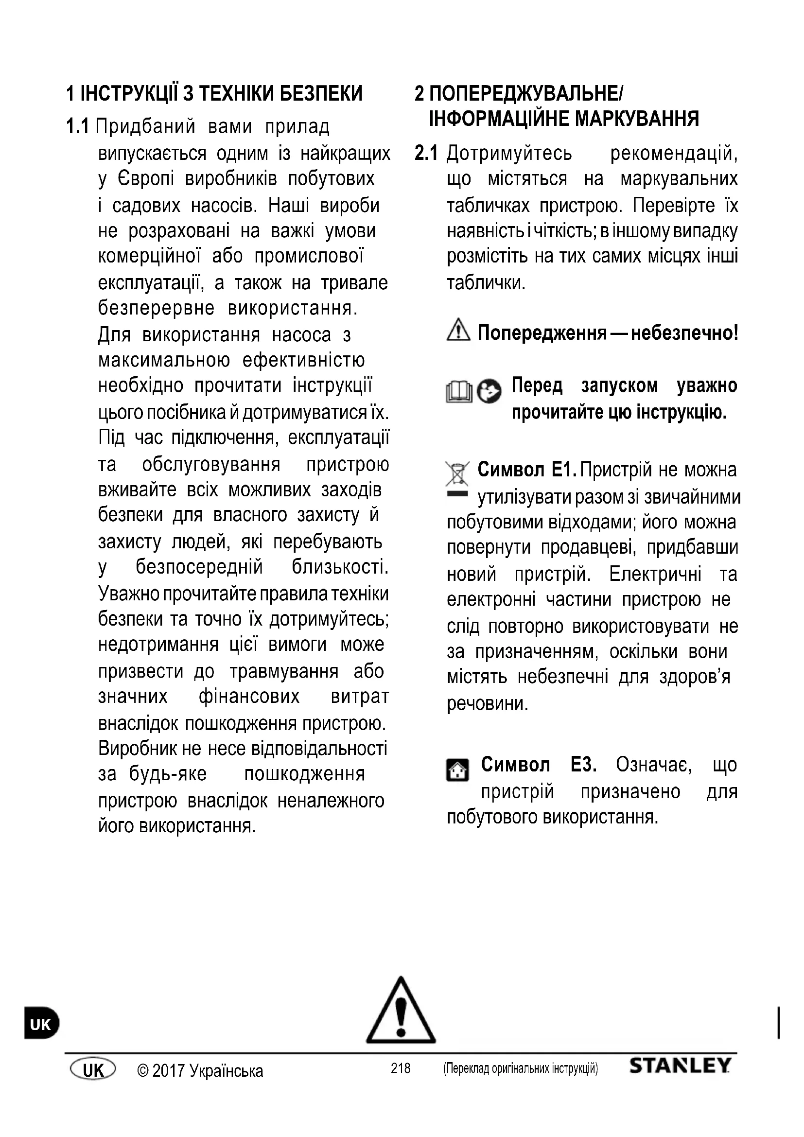 Символ E3. Означає, що пристрій призначено для побутового використання.219 (Переклад оригінальних інструкцій) © 2017 Українська (Переклад оригінальних інструкцій) © 2017 УкраїнськаUK