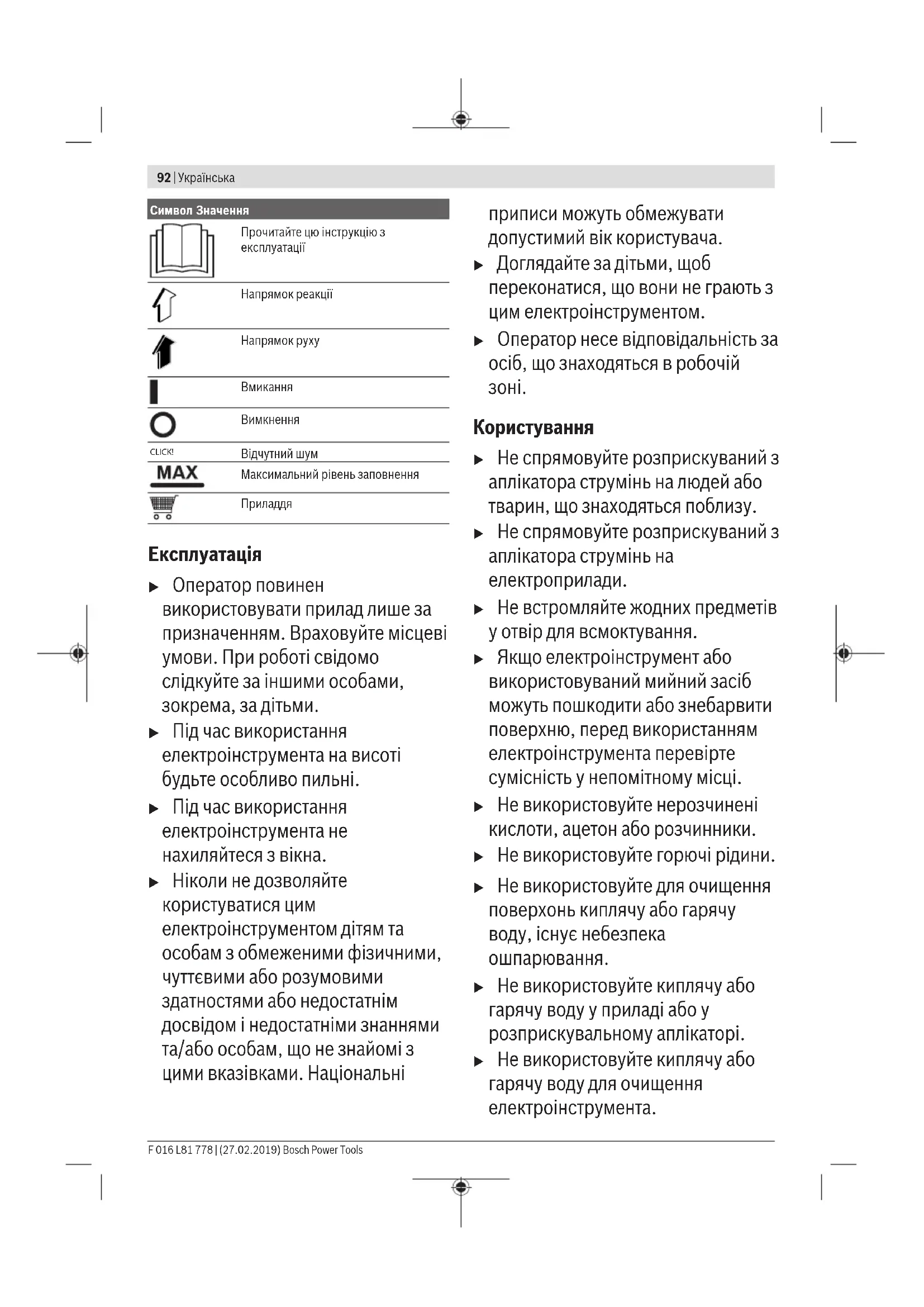 Символ Значення Загальна вказівка про небезпеку Bosch Power Tools F 016 L81 778 | (27.02.2019)92 | Українська Символ Значення Прочитайте цю інструкцію з експлуатації Напрямок реакції Напрямок руху