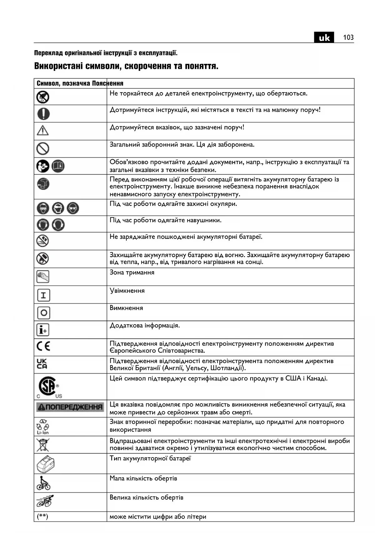 Додаткова інформація. Підтвердження відповідності електроінструменту положенням директив Європейського Співтовариства. Підтвердження відповідності електроінструмента положенням директив Великої Британії (Англії, Уельсу, Шотландії). Цей символ підтверджує сертифікацію цього продукту в США і Канаді. Ця вказівка повідомляє про можливість виникнення небезпечної ситуації, яка може привести до серйозних травм або смерті. Знак вторинної переробки: позначає матеріали, що придатні для повторного використання Відпрацьовані електроі нструменти та інші електротехнічні і електронні вироби повинні здаватися окремо і утилізуватися екологічно чистим способом. Тип акумуляторної батареї Мала кількість обертів Велика кількість обертів (**) може містити цифри або літери104