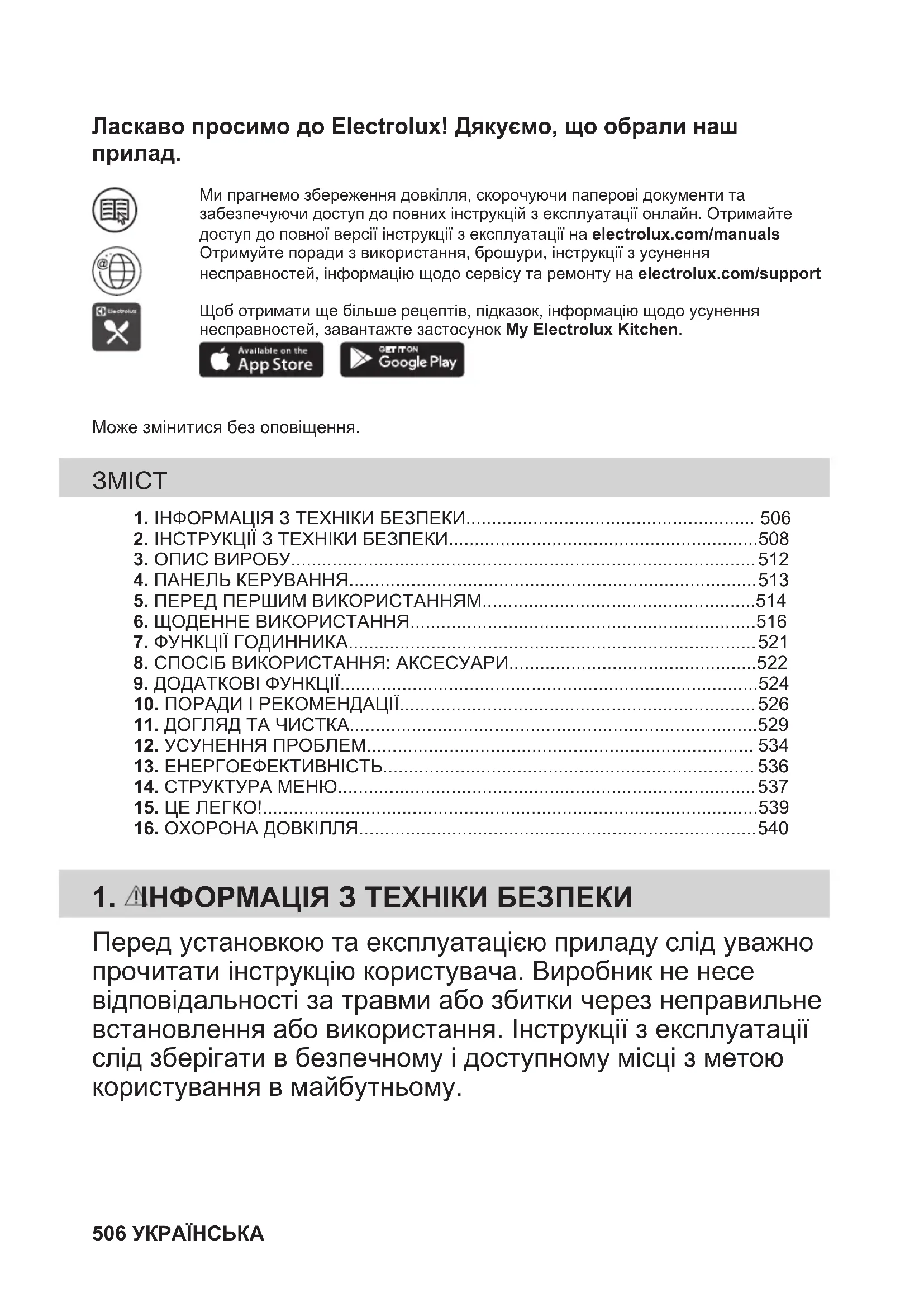 Ми прагнемо збереження довкілля, скорочуючи паперові документи тазабезпечуючи доступ до повних інструкцій з експлуатації онлайн. Отримайтедоступ до повної версії інструкції з експлуатації на electrolux.com/manualsОтримуйте поради з використання, брошури, інструкції з усуненнянесправностей, інформацію щодо сервісу та ремонту на electrolux.com/supportЩоб отримати ще більше рецептів, підказок, інформацію щодо усуненнянесправностей, завантажте застосунок My Electrolux Kitchen.Може змінитися без оповіщення. 1. ІНФОРМАЦІЯ З ТЕХНІКИ БЕЗПЕКИ........................................................ 5062. ІНСТРУКЦІЇ З ТЕХНІКИ БЕЗПЕКИ............................................................508