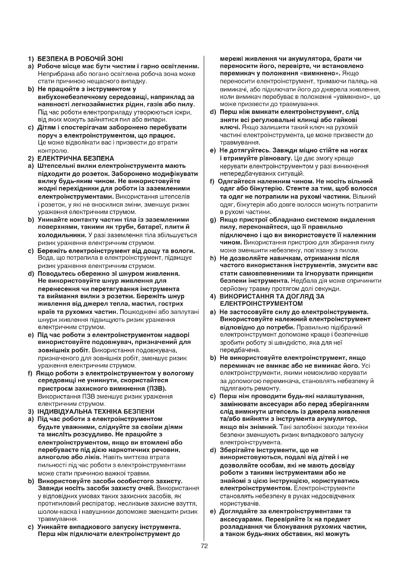 a) Під час роботи з електроінструментом будьте уважними, слідкуйте за своїми діями та мисліть розсудливо. Не працюйте з електроінструментом, якщо ви втомлені або перебуваєте під дією наркотичних речовин, алкоголю або ліків. Навіть миттєва втрата пильності під час роботи з електроінструментами може стати причиною важкої травми. b) Використовуйте засоби особистого захисту. Завжди носіть засоби захисту очей. Використання у відповідних умовах таких захисних засобів, як протипиловий респіратор, неслизьке захисне взуття, шолом-каска і навушники допоможе зменшити ризик травмування. c) Уникайте випадкового запуску інструмента. Перш ніж підключати електроінструмент до73 a) Обслуговування електроінструмента повинен виконувати кваліфікований ремонтник із використанням лише ідентичних запасних частин. Це забезпечить нормальну роботу електроінструмента. b) Ніколи не ремонтуйте пошкоджені акумулятори. Сервісне обслуговування акумуляторних батарей має виконувати лише виробник або авторизовані постачальники послуг. ВКАЗІВКИ З БЕЗПЕКИ ДЛЯ ШАБЕЛЬНОЇ ПИЛКИ З БЕЗЩІТКОВИМ МОТОРОМ