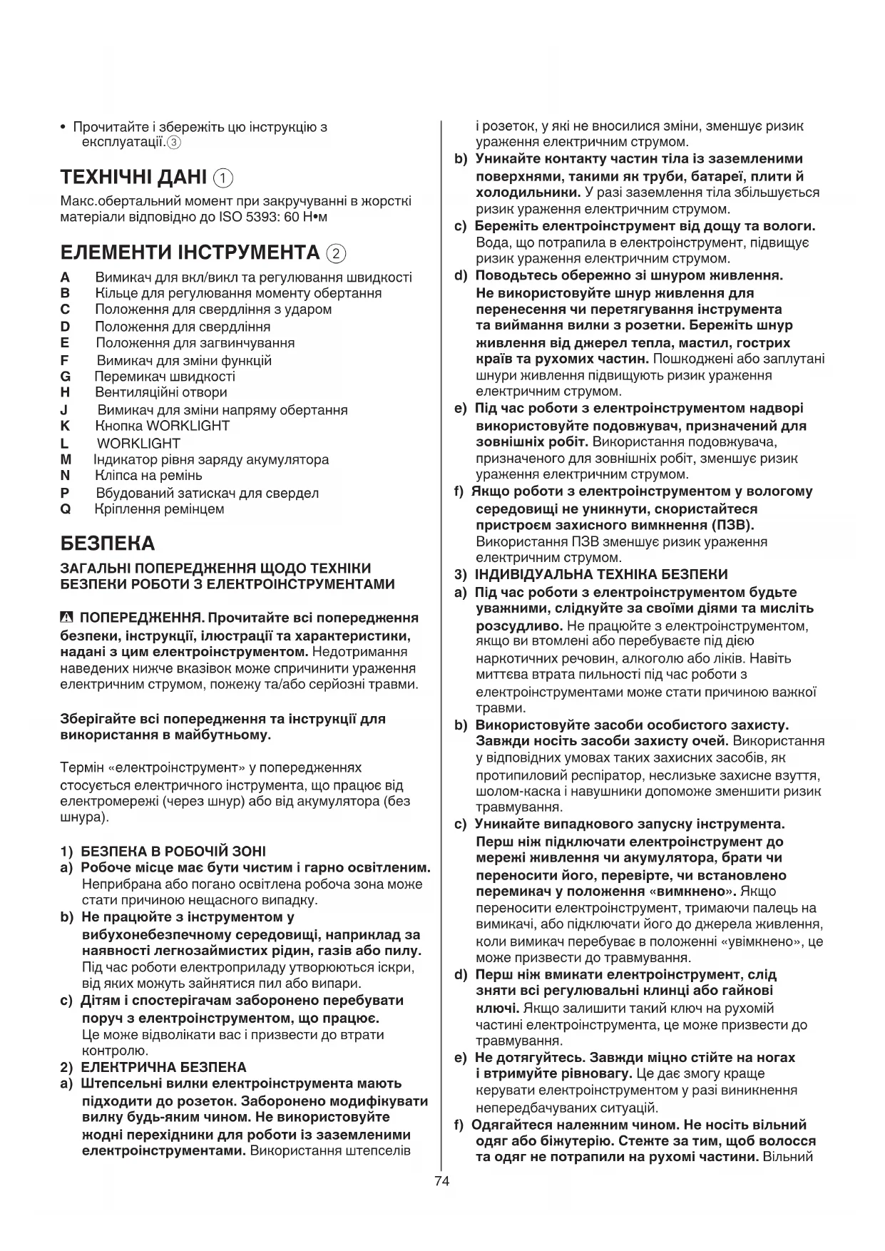 - Прочитайте і збережіть цю інструкцію з експлуатації.3 ТЕХНІЧНІ ДАНІ 1 Макс.обертальний момент при закручуванні в жорсткі матеріали відповідно до ISO 5393: 60 Н•м ЕЛЕМЕНТИ ІНСТРУМЕНТА 2 A Вимикач для вкл/викл та регулювання швидкості B Кільце для регулювання моменту обертання C Положення для свердління з ударом D Положення для свердління E Положення для загвинчування F Вимикач для зміни функцій G Перемикач швидкості H Вентиляційні отвори