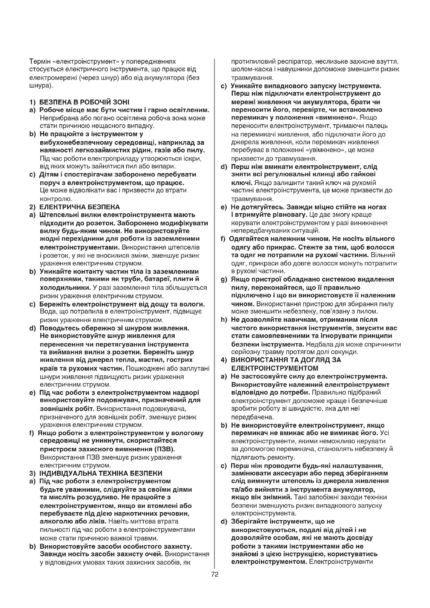 - При использовании инструмента в других целях или с другими либо неисправными72 протипиловий респіратор, неслизьке захисне взуття, шолом-каска і навушники допоможе зменшити ризик травмування. c) Уникайтевипадковогозапускуінструмента. Першніжпідключатиелектроінструментдо мережіживленнячиакумулятора,братичи переноситийого,перевірте,чивстановлено перемикачуположення«вимкнено». Якщо переносити електроінструмент, тримаючи палець на перемикачі живлення, або підключати його до джерела живлення, коли перемикач живлення перебуває в положенні «увімкнено», це може призвести до травмування. d) Першніжвмикатиелектроінструмент,слід знятивсірегулювальніклинціабогайкові ключі.Якщо залишити такий ключ на рухомій частині електроінструмента, це може призвести до травмування. e) Недотягуйтесь.Завждиміцностійтенаногах івтримуйтерівновагу.Це дає змогу краще керувати електроінструментом у разі виникнення непередбачуваних ситуацій. f) Одягайтесяналежнимчином.Неносітьвільного одягуабоприкрас.Стежтезатим,щобволосся таодягнепотрапилинарухомічастини.Вільний одяг, прикраси або довге волосся можуть потрапити в рухомі частини. g) Якщопристроїобладнаносистемоювидалення пилу,переконайтеся,щоїїправильно підключеноіщовивикористовуєтеїїналежним чином.Використання пристрою для збирання пилу може зменшити небезпеку, пов’язану з пилом. h) Недозволяйтенавичкам,отриманимпісля частоговикористанняінструментів,змуситивас статисамовпевненимитаігноруватипринципи безпекиінструмента.Недбала дія може спричинити серйозну травму протягом долі секунди.