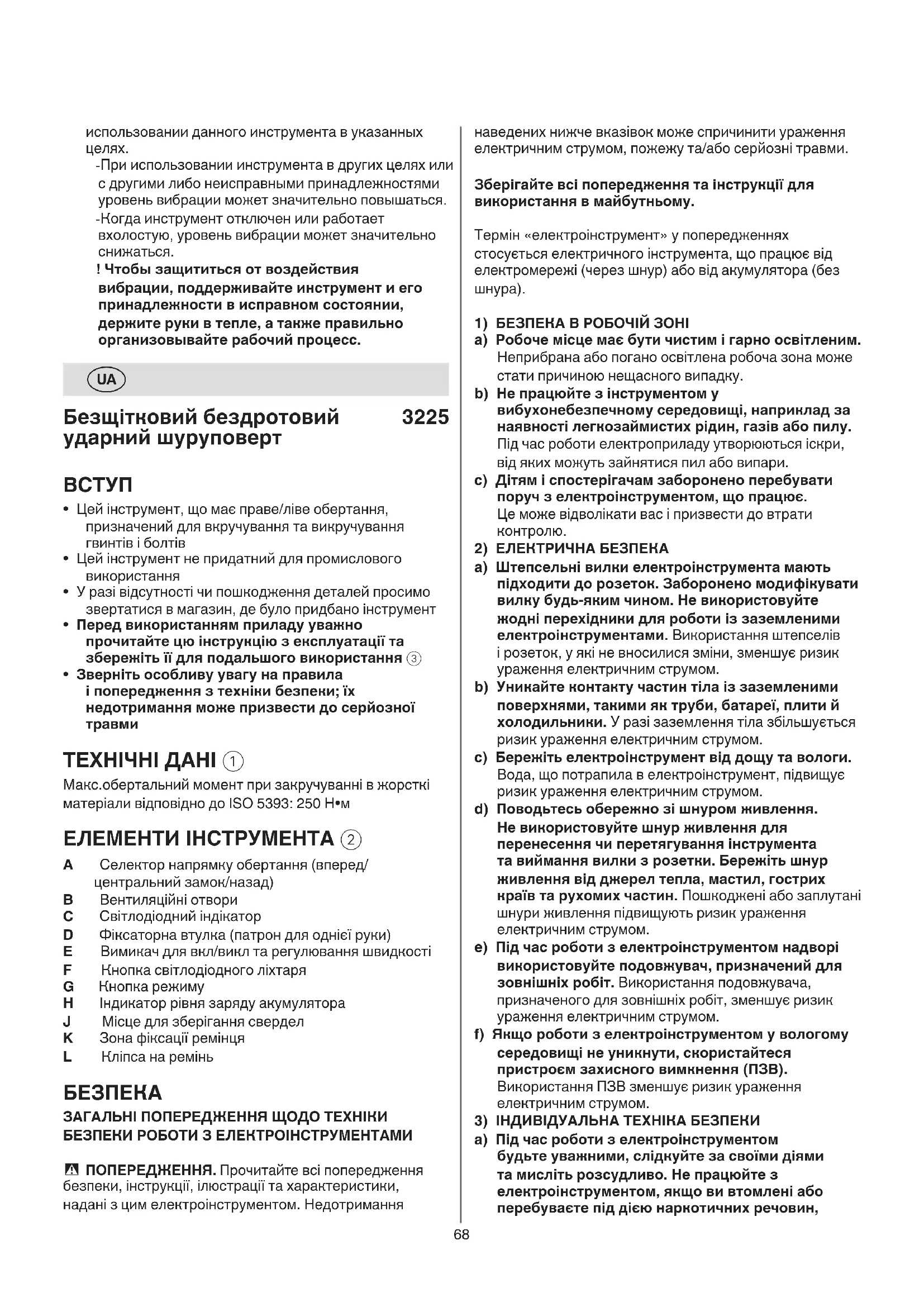 ТЕХНІЧНІ ДАНІ 1 Макс.обертальний момент при закручуванні в жорсткі матеріали відповідно до ISO 5393: 250 Н•м ЕЛЕМЕНТИ ІНСТРУМЕНТА 2 A Селектор напрямку обертання (вперед/ центральний замок/назад) B Вентиляційні отвори C Світлодіодний індікатор D Фіксаторна втулка (патрон для однієї руки) E Вимикач для вкл/викл та регулювання швидкості F Кнопка світлодіодного ліхтаря G Кнопка режиму H Індикатор рівня заряду акумулятора