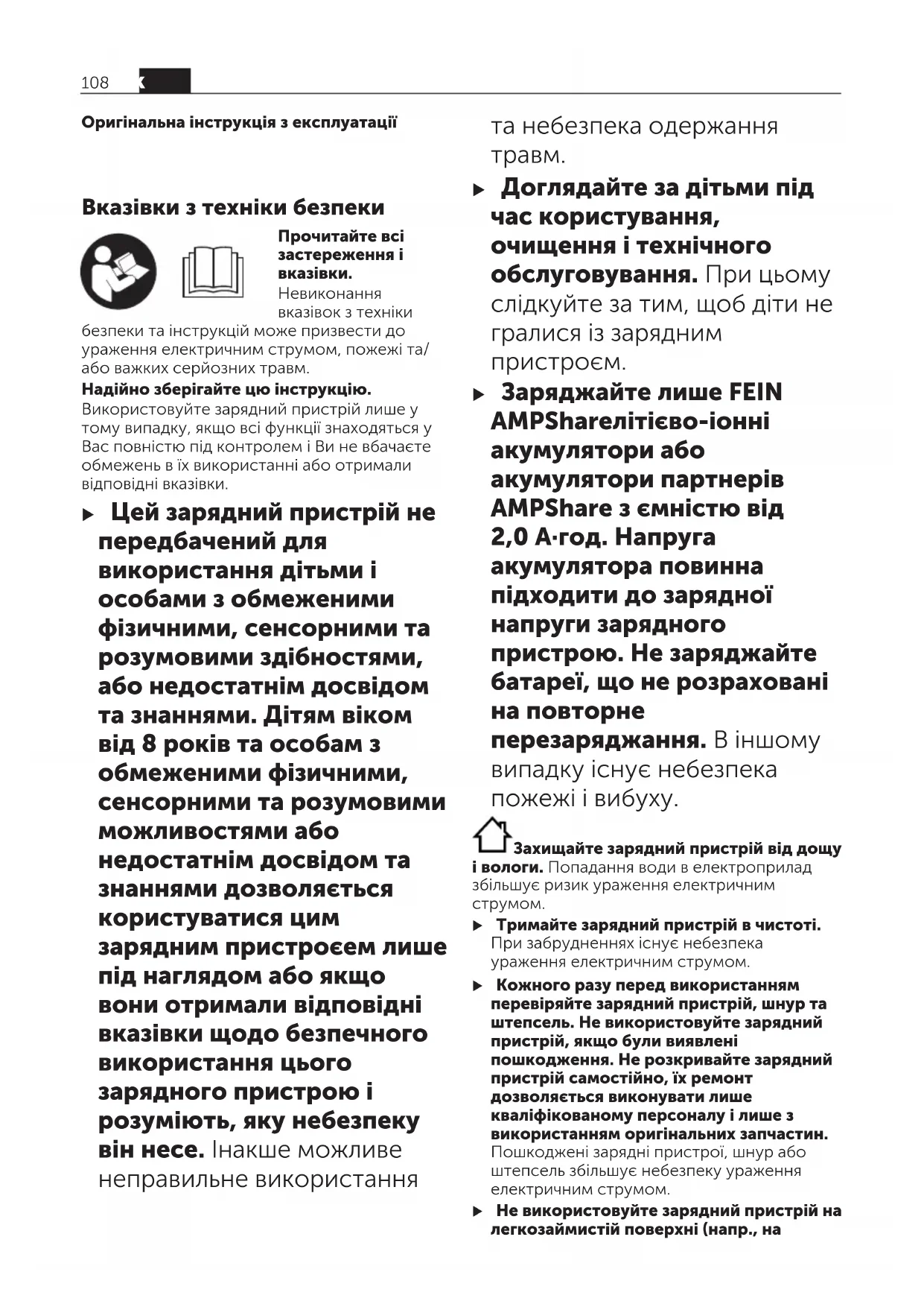 Невиконання вказівок з техніки безпеки та інструкцій може призвести до ураження електричним струмом, пожежі та/ або важких серйозних травм. Надійно зберігайте цю інструкцію. Використовуйте зарядний пристрій лише у тому випадку, якщо всі функції знаходяться у Вас повністю під контролем і Ви не вбачаєте обмежень в їх використанні або отримали відповідні вказівки. u Цей зарядний пристрій не передбачений для використання дітьми і особами з обмеженими фізичними, сенсорними та розумовими здібностями, або недостатнім досвідом та знаннями. Дітям віком від 8 років та особам з обмеженими фізичними, сенсорними та розумовими можливостями або недостатнім досвідом та знаннями дозволяється користуватися цим зарядним пристроєем лише під наглядом або якщо вони отримали відповідні вказівки щодо безпечного використання цього зарядного пристрою і розуміють, яку небезпеку він несе. Інакше можливе неправильне використання та небезпека одержання