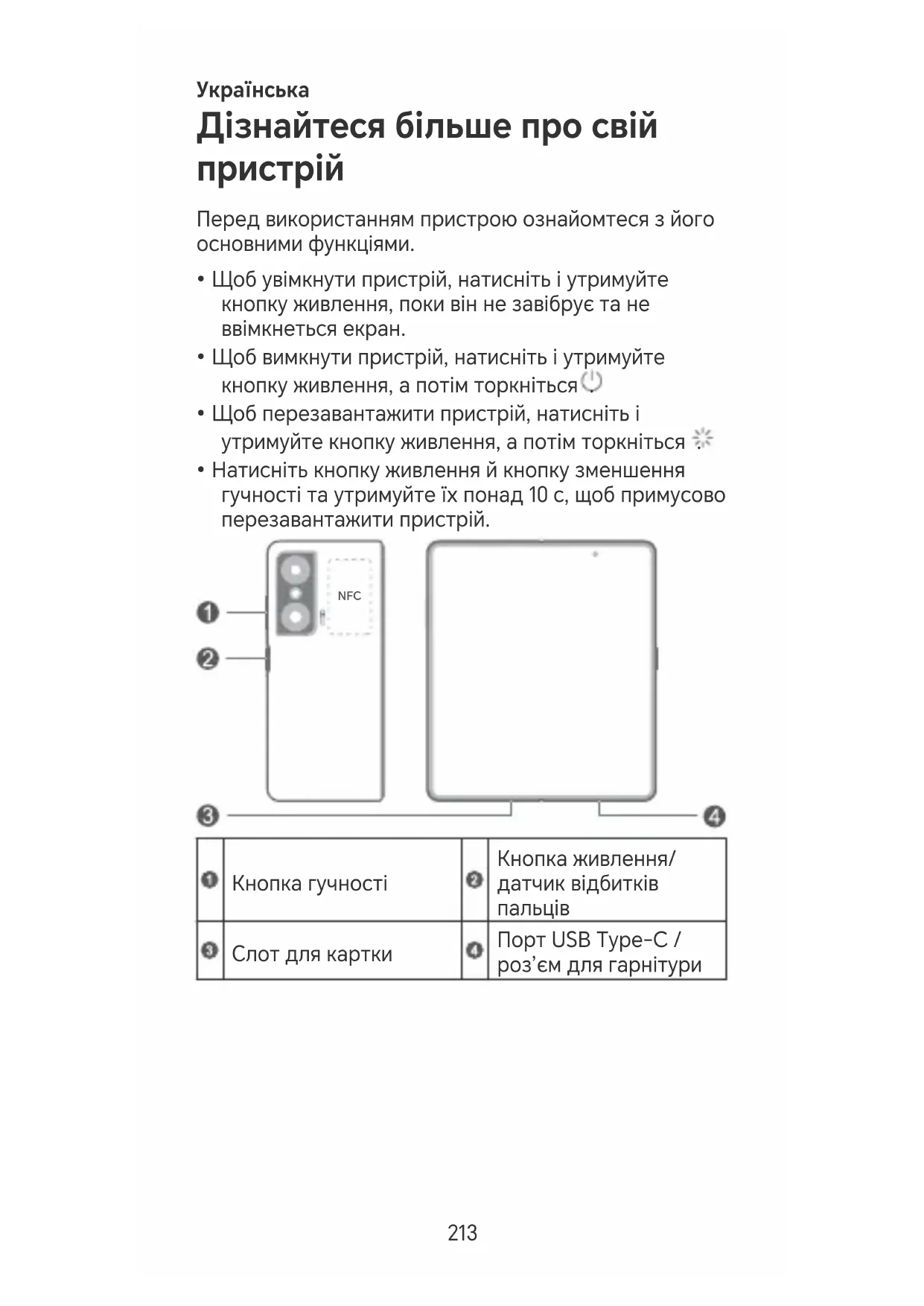 Слот для картки Порт USB Type-C / роз’єм для гарнітури 213• При використанні функції NFC утримуйте область NFC близько до інших пристроїв або