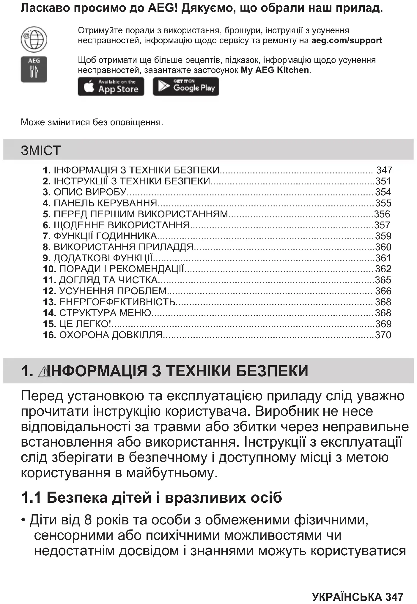 Återvinn material med symbolen . Återvinn förpackningen genom att placera den i lämpligt kärl. Bidra till att skydda vår miljö och vår hälsa genom att återvinna avfall från elektriska och elektroniska produkter. Släng inte produkter märkta med symbolen med hushållsavfallet. Lämna in produkten på närmaste återvinningsstation eller kontakta kommunkontoret. 346 SVENSKAЛаскаво просимо до AEG! Дякуємо, що обрали наш прилад. Отримуйте поради з використання, брошури, інструкції з усуненнянесправностей, інформацію щодо сервісу та ремонту на aeg.com/supportЩоб отримати ще більше рецептів, підказок, інформацію щодо усуненнянесправностей, завантажте застосунок My AEG Kitchen.Може змінитися без оповіщення. 1. ІНФОРМАЦІЯ З ТЕХНІКИ БЕЗПЕКИ........................................................ 3472. ІНСТРУКЦІЇ З ТЕХНІКИ БЕЗПЕКИ............................................................351