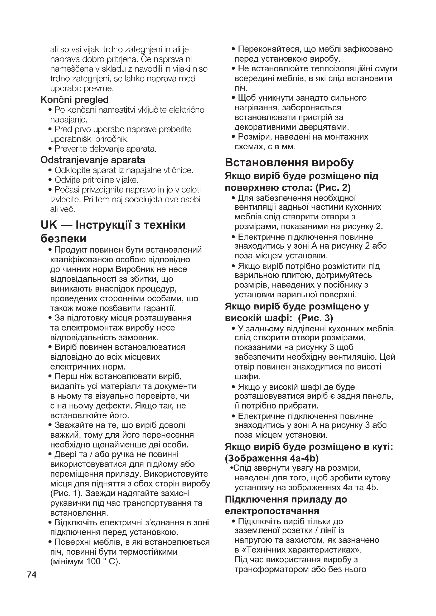 - Слід звернути увагу на розміри, наведені для того, щоб зробити кутову установку на зображеннях 4а та 4b. Підключення приладу до електропостачання