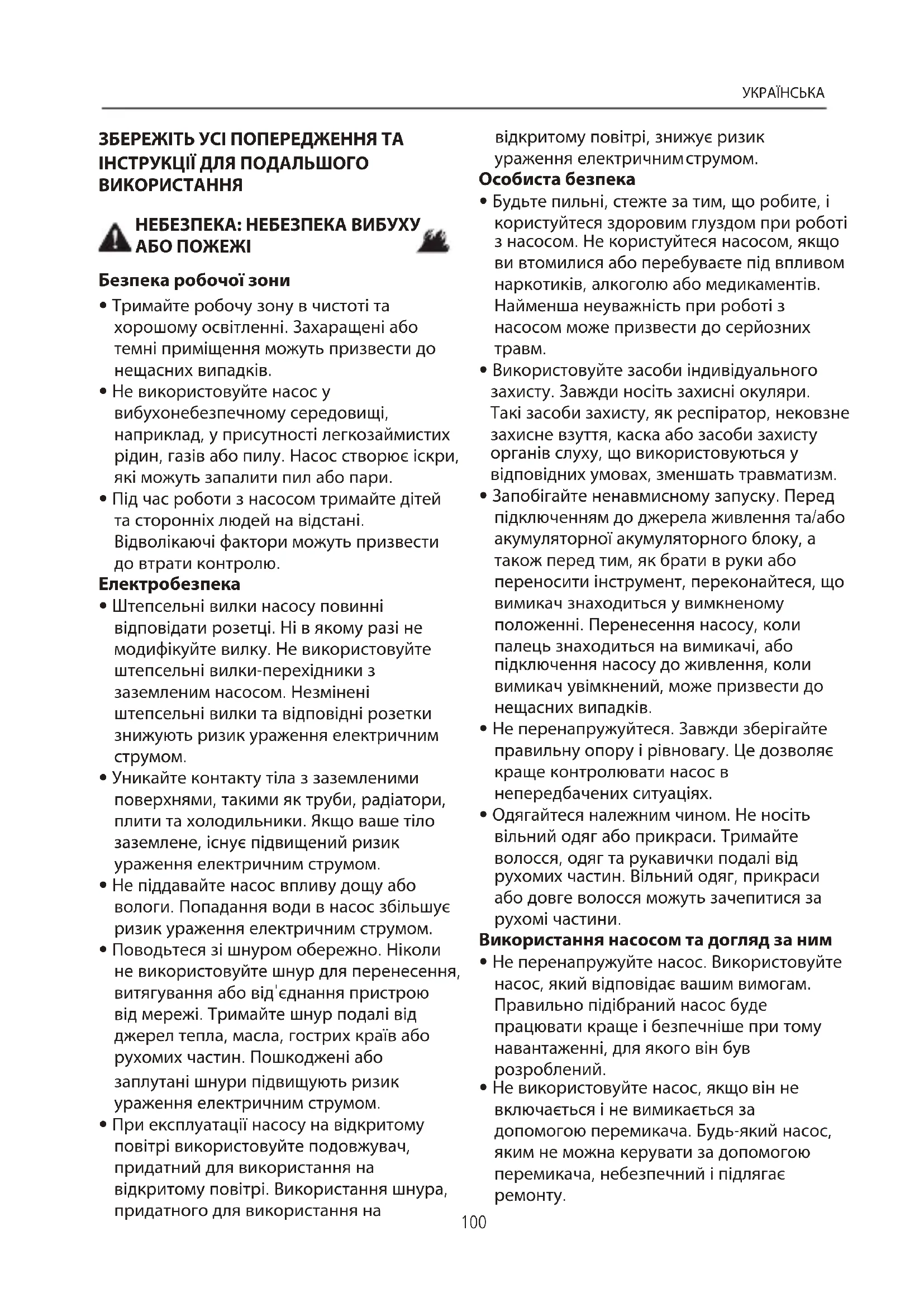 ПОПЕРЕДЖЕННЯ: будьте пильні, стежте за тим, що робите, і користуйтеся здоровим глуздом при роботі з електроінструментом. Не користуйтеся насосом, якщо ви втомилися або перебуваєте під впливом наркотиків, алкоголю або медикаментів. Найменша неуважність при роботі з насосом може призвести до серйозних травм. Ніколи не направляйте насадку або розпилювач на будь-яку частину тіла, а також на інших людей або тварин. ПОПЕРЕДЖЕННЯ: НЕБЕЗПЕКА, ПОВ'ЯЗАНА З ЛІТАЮЧИМИ ПРЕДМЕТАМИ. Ваш насос працює від електрики. Як і будь-який інший пристрій з електричним приводом, неправильне використання його може призвести до ураження електричним