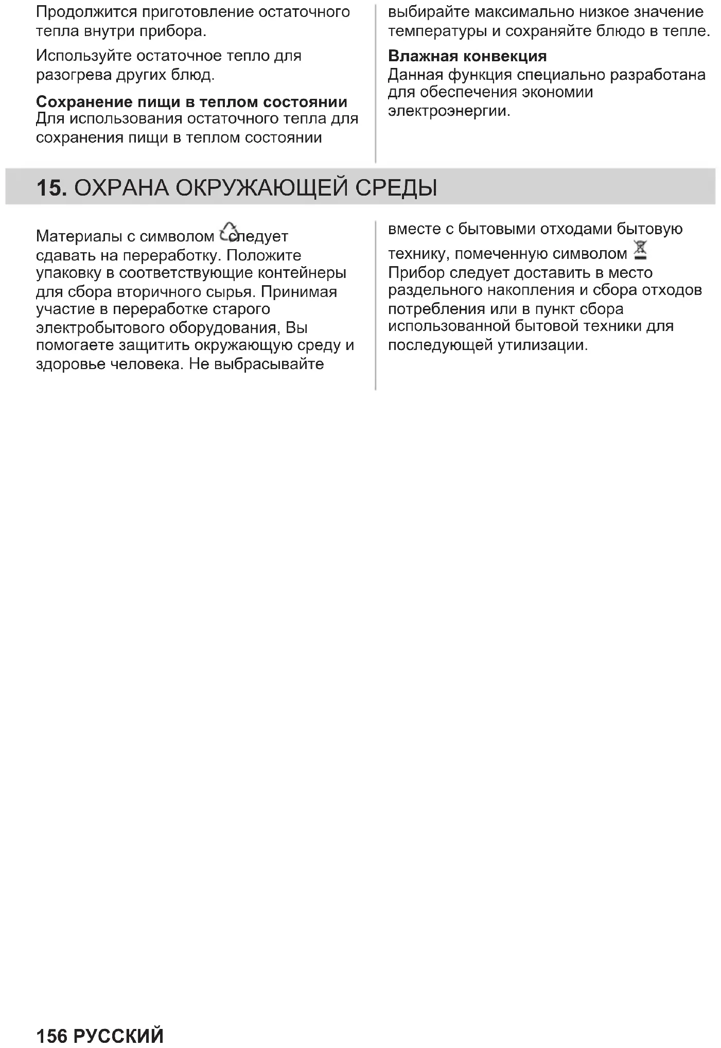 Використовуйте залишкове тепло для розігрівання інших страв. Підтримування страви теплою Виберіть найнижчу температуру з можливих, щоб використати залишкове тепло для збереження їжі теплою. Волога конвекція Функція, призначена для збереження енергії під час готування. 178 УКРАЇНСЬКА15. ОХОРОНА ДОВКІЛЛЯ Здавайте на повторну переробку матеріали, позначені відповідним символом . Викидайте упаковку у відповідні контейнери для вторинної сировини. Допоможіть захистити навколишнє середовище та здоров’я інших людей і забезпечити вторинну переробку електричних і електронних приладів. Не викидайте прилади, позначені відповідним символом , разом з іншим домашнім сміттям. Поверніть продукт до заводу із вторинної переробки у вашій місцевості або зверніться до місцевих муніципальних органів влади. УКРАЇНСЬКА 179 *867376380-A-082023
