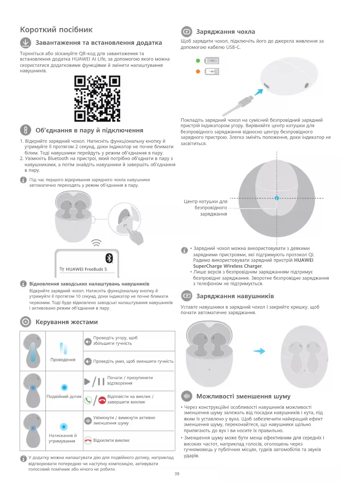 Об’єднання в пару й підключення Під час першого відкривання зарядного чохла навушники автоматично переходять у режим об’єднання в пару. Відкрийте зарядний чохол. Натисніть функціональну кнопку й утримуйте її протягом 10секунд, доки індикатор не почне блимати червоним. Тоді буде відновлено заводські налаштування навушників і активовано режим об’єднання в пару. Відновлення заводських налаштувань навушників Торкніться або зіскануйте QR-код для завантаження та встановлення додатка HUAWEI AILife, за допомогою якого можна скористатися додатковими функціями й змінити налаштування навушників. Завантаження та встановлення додатка Керування жестами У додатку можна налаштувати дію для подвійного дотику, наприклад відтворювати попередню чи наступну композицію, активувати голосовий помічник або нічого не робити. Щоб зарядити чохол, підключіть його до джерела живлення за допомогою кабелю USB-C. Покладіть зарядний чохол на сумісний безпровідний зарядний пристрій індикатором угору. Вирівняйте центр котушки для безпровідного заряджання відносно центру безпровідного зарядного пристрою. Злегка змініть положення, доки індикатор не засвітиться. Заряджання чохла Можливості зменшення шуму
