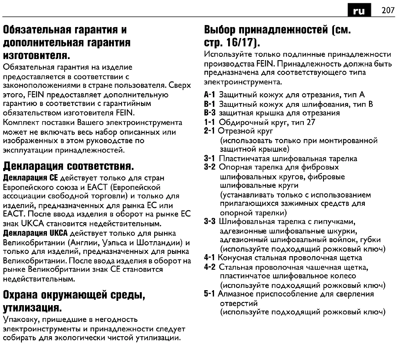 Вибір приладдя (див. стор. 16/17). Використовуйте лише оригінальне приладдя FEIN. Приладдя повинне бути призначене для типу електроінструменту. A-1 Захисний кожух для розрізання, тип A B-1 Захисний кожух для шліфування, тип B B-3 Захисна кришка для відрізання 1-1 Обдирний круг, тип 27 2-1 Відрізний круг (використовуйте лише з монтованою захисною