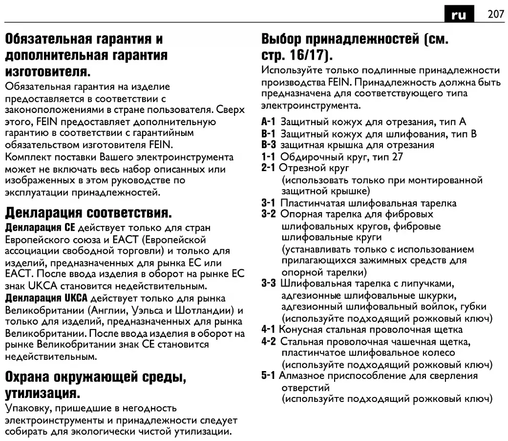 Вибір приладдя (див. стор. 16/17). Використовуйте лише оригінальне приладдя FEIN. Приладдя повинне бути призначене для типу електроінструменту. A-1 Захисний кожух для розрізання, тип A B-1 Захисний кожух для шліфування, тип B B-3 Захисна кришка для відрізання 1-1 Обдирний круг, тип 27 2-1 Відрізний круг (використовуйте лише з монтованою захисною