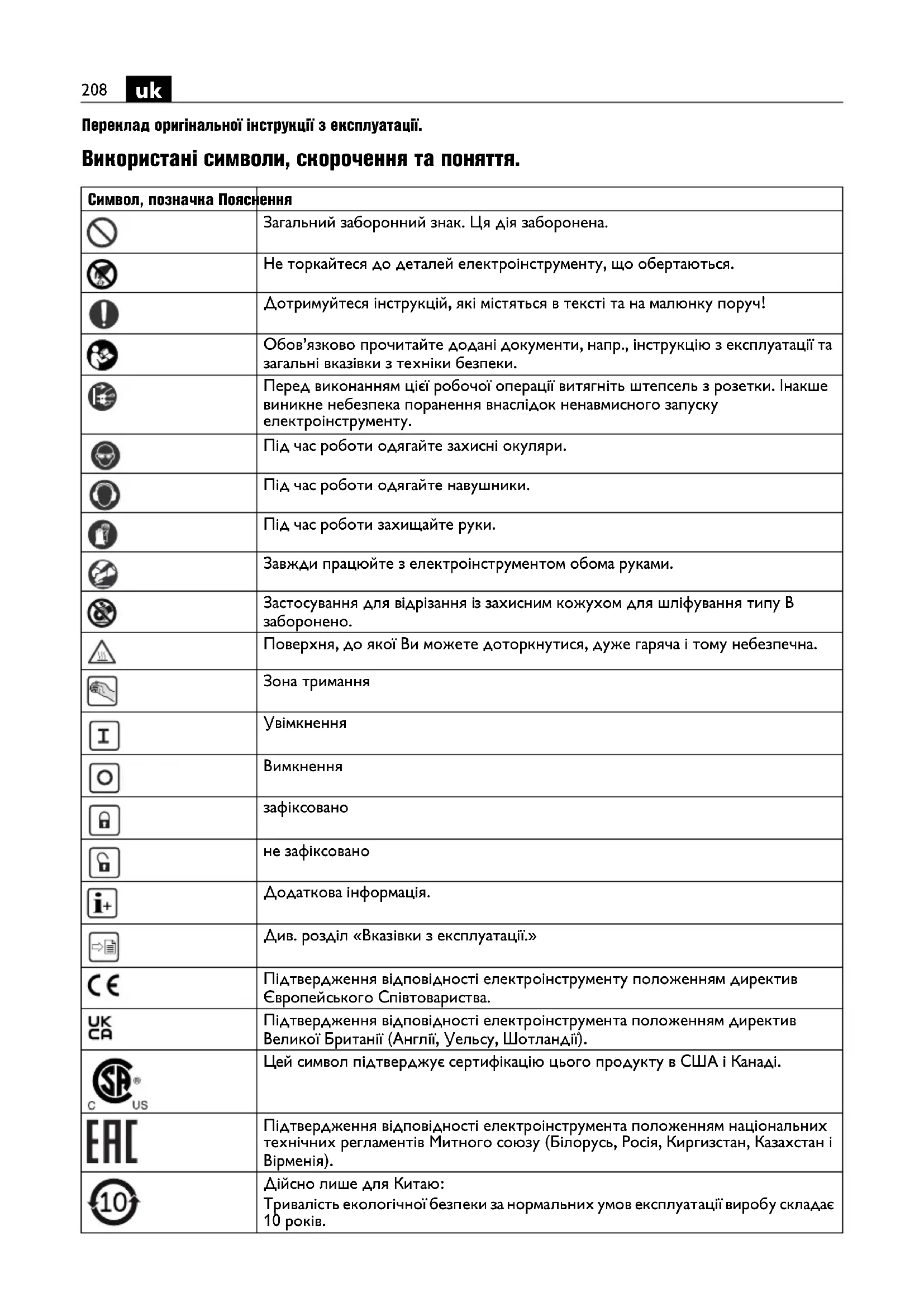 Переклад оригінальної інструкції з експлуатації. Використані символи, скорочення та поняття. Символ, позначка Пояснення Загальний заборонний знак. Ця дія заборонена. Не торкайтеся до деталей електроінструменту, що обертаються. Дотримуйтеся інструкцій, які містяться в тексті та на малюнку поруч! Обов’язково прочитайте додані документи, напр., інструкцію з експлуатації та загальні вказівки з техніки безпеки. Перед виконанням цієї робочої операції витягніть штепсель з розетки. Інакше виникне небезпека поранення внаслідок ненавмисного запуску електроінструменту. Під час роботи одягайте захисні окуляри. Під час роботи одягайте навушники. Під час роботи захищайте руки. Завжди працюйте з електроінструментом обома руками. Застосування для відрізання і з захисним кожухом для шліфування типу B заборонено. Поверхня, до якої Ви можете доторкнутися, дуже гаряча і тому небезпечна. Зона тримання