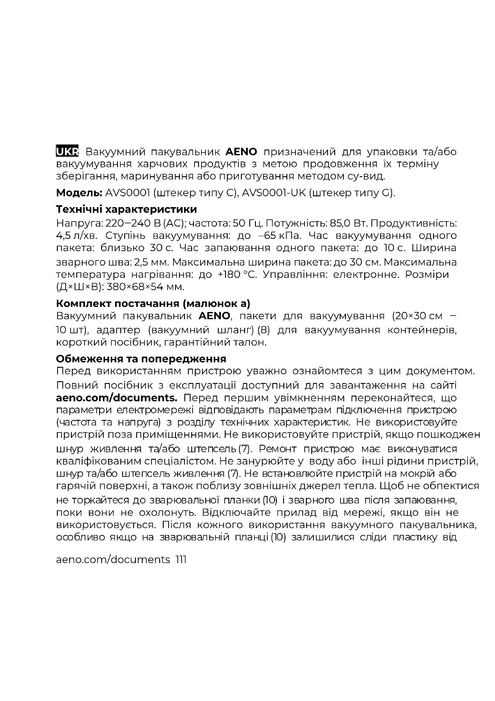 ASBISc задржава право да модификује уређај и врши измене и допуне овог документа без претходног обавештења корисника. Гарантни период и употребни век је 2 године од датума куповине робе. Информације о произвођачу: ASBISc Enterprises PLC, Iapetou, 1, Agios Athanasios, 4101, Limassol, Cyprus (Кипар). Произведено у Кини. Ажурне информације и детаљан опис уређаја, као и упутства за повезивање, сертификати, информације о друштвима који примају рекламације за квалитет и гаранције, доступне су за преузимање на линку aeno.com/documents. Сви наведени заштитни знакови и њихови називи су својина њихових власника.aeno.com/documents 111 UKR Вакуумний пакувальник AENO призначений для упаковки та/або вакуумування харчових продуктів з метою продовження їх терміну зберігання, маринування або приготування методом су-вид. Модель: AVS0001 (штекер типу C), AVS0001-UK (штекер типу G). Технічні характеристики Напруга: 220‒240 В (AC); частота: 50 Гц. Потужність: 85,0 Вт. Продуктивність: 4,5 л/хв. Ступінь вакуумування: до –65 кПа. Час вакуумування одного пакета: близько 30 с. Час запаювання одного пакета: до 10 с. Ширина зварного шва: 2,5 мм. Максимальна ширина пакета: до 30 см. Максимальна температура нагрівання: до +180 °C. Управління: електронне. Розміри (Д×Ш×В): 380×68×54 мм. Комплект постачання (малюнок a) Вакуумний пакувальник AENO, пакети для вакуумування (20×30 см ‒ 10 шт), адаптер (вакуумний шланг) (8) для вакуумування контейнерів, короткий посібник, гарантійний талон. Обмеження та попередження Перед використанням пристрою уважно ознайомтеся з цим документом. Повний посібник з експлуатації доступний для завантаження на сайті aeno.com/documents. Перед першим увімкненням переконайтеся, що параметри електромережі відповідають параметрам підключення пристрою (частота та напруга) з розділу технічних характеристик. Не використовуйте пристрій поза приміщеннями. Не використовуйте пристрій, якщо пошкоджено шнур живлення та/або штепсель (7). Ремонт пристрою має виконуватися кваліфікованим спеціалістом. Не занурюйте у воду або інші рідини пристрій, шнур та/або штепсель живлення (7). Не встановлюйте пристрій на мокрій або гарячій поверхні, а також поблизу зовнішніх джерел тепла. Щоб не обпектися, не торкайтеся до зварювальної планки (10) і зварного шва після запаювання, поки вони не охолонуть. Відключайте прилад від мережі, якщо він не використовується. Після кожного використання вакуумного пакувальника, особливо якщо на зварювальній планці (10) залишилися сліди пластику від112 aeno.com/documents пакета або рідина, або якщо крихти або частинки продуктів потрапили у вакуумну камеру (11), необхідно зробити очищення. Від'єднайте прилад від мережі, вийнявши штепсель шнура живлення (7) з розетки, і дайте охолонути. Протріть його поверхню м'якою тканиною, змоченою у теплій воді або слабкому мильному розчині. Потім протріть м'якою тканиною, змоченою у чистій воді, і витріть насухо. Не використовуйте агресивні миючі засоби, абразивні пасти, поліруючі та миючі засоби, що містять кислоти та розчинники. Використовуйте вакуумний пакувальник для вакуумування та/або запаювання лише сухих продуктів. Пристрій не призначений для роботи з вологими продуктами та рідкою їжею. Використовуйте лише спеціальні пакети та контейнери для вакуумних пакувальників. Адаптер (вакуумний шланг) (8), що постачається у комплекті з вакуумним пакувальником, використовується тільки для відкачування повітря зі 