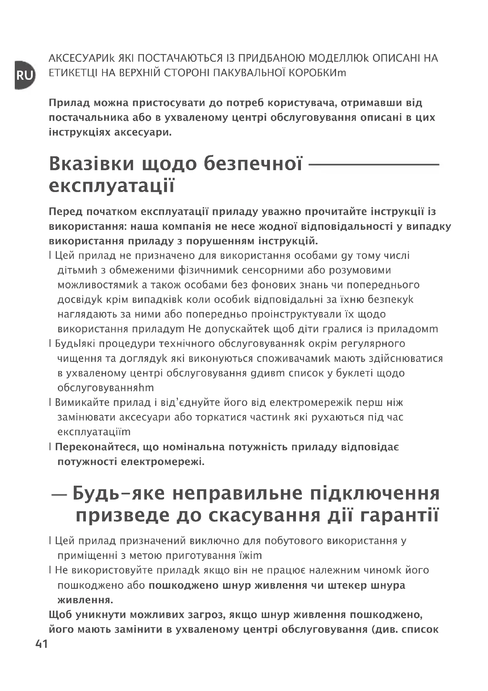 АКСЕСУАРИ, ЯКІ ПОСТАЧАЮТЬСЯ ІЗ ПРИДБАНОЮ МОДЕЛЛЮ, ОПИСАНІ НА ЕТИКЕТЦІ НА ВЕРХНІЙ СТОРОНІ ПАКУВАЛЬНОЇ КОРОБКИ. Прилад можна пристосувати до потреб користувача, отримавши від постачальника або в ухваленому центрі обслуговування описані в цих інструкціях аксесуари. Вказівки щодо безпечної експлуатації Перед початком експлуатації приладу уважно прочитайте інструкції із використання: наша компанія не несе жодної відповідальності у випадку використання приладу з порушенням інструкцій. - Цей прилад не призначено для використання особами (у тому числі дітьми) з обмеженими фізичними, сенсорними або розумовими можливостями, а також особами без фонових знань чи попереднього досвіду, крім випадків, коли особи, відповідальні за їхню безпеку, наглядають за ними або попередньо проінструктували їх щодо використання приладу. Не допускайте, щоб діти гралися із приладом. - Будь-які процедури технічного обслуговування, окрім регулярного чищення та догляду, які виконуються споживачами, мають здійснюватися в ухваленому центрі обслуговування (див. список у буклеті щодо обслуговування). - Вимикайте прилад і від’єднуйте його від електромережі, перш ніж замінювати аксесуари або торкатися частин, які рухаються під час експлуатації. - Переконайтеся, що номінальна потужність приладу відповідає потужності електромережі. Будь-яке неправильне підключення призведе до скасування дії гарантії - Цей прилад призначений виключно для побутового використання у приміщенні з метою приготування їжі. - Не використовуйте прилад, якщо він не працює належним чином, його пошкоджено або пошкоджено шнур живлення чи штекер шнура