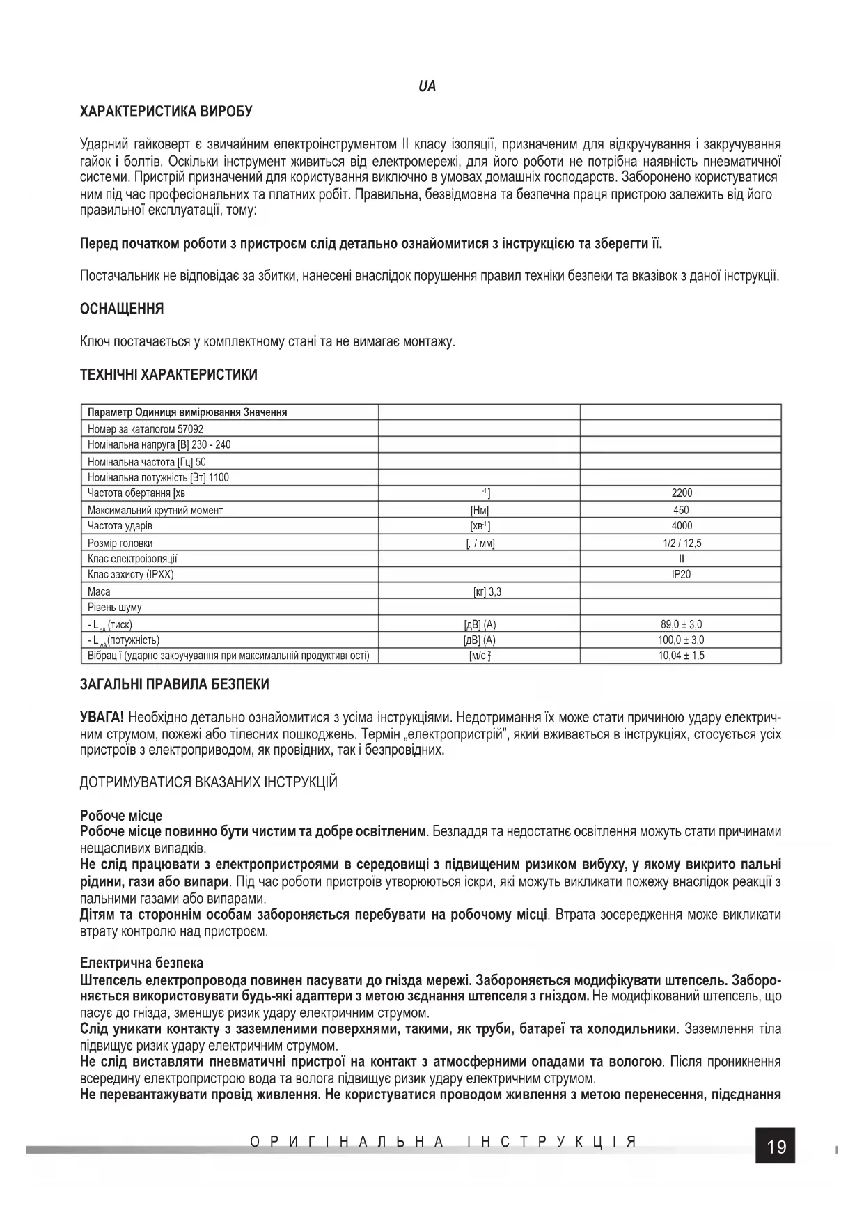 ХАРАКТЕРИСТИКА ВИРОБУ Ударний гайковерт є звичайним електроінструментом II класу ізоляції, призначеним для відкручування і закручування гайок і болтів. Оскільки інструмент живиться від електромережі, для його роботи не потрібна наявність пневматичної системи. Пристрій призначений для користування виключно в умовах домашніх господарств. Заборонено користуватися ним під час професіональних та платних робіт. Правильна, безвідмовна та безпечна праця пристрою залежить від його правильної експлуатації, тому: Перед початком роботи з пристроєм слід детально ознайомитися з інструкцією та зберегти її. Постачальник не відповідає за збитки, нанесені внаслідок порушення правил техніки безпеки та вказівок з даної інструкції.
