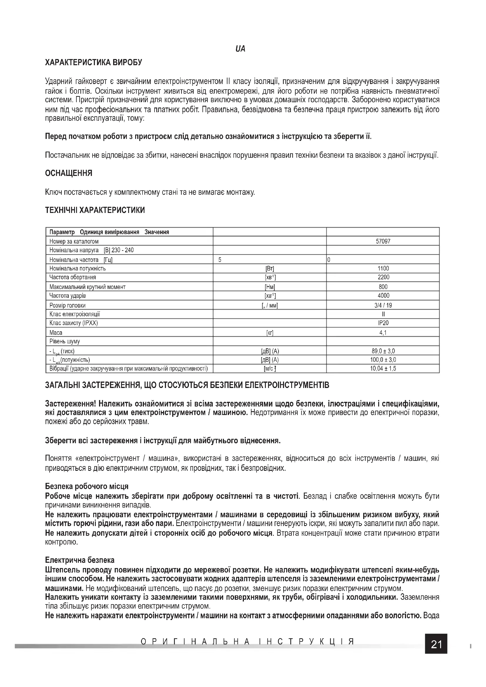 ХАРАКТЕРИСТИКА ВИРОБУ Ударний гайковерт є звичайним електроінструментом II класу ізоляції, призначеним для відкручування і закручування гайок і болтів. Оскільки інструмент живиться від електромережі, для його роботи не потрібна наявність пневматичної системи. Пристрій призначений для користування виключно в умовах домашніх господарств. Заборонено користуватися ним під час професіональних та платних робіт. Правильна, безвідмовна та безпечна праця пристрою залежить від його правильної експлуатації, тому: Перед початком роботи з пристроєм слід детально ознайомитися з інструкцією та зберегти її. Постачальник не відповідає за збитки, нанесені внаслідок порушення правил техніки безпеки та вказівок з даної інструкції.