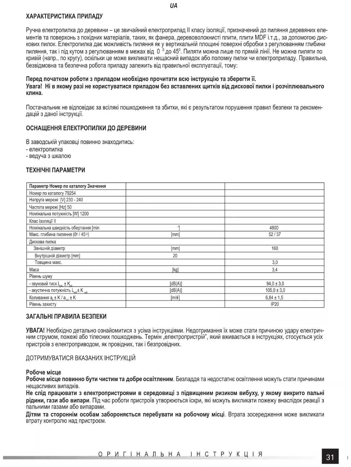 Постачальник не відповідає за всілякі пошкодження та збитки, які є результатом порушення правил безпеки та рекомен- дацій з даної інструкції. ОСНАЩЕННЯ ЕЛЕКТРОПИЛКИ ДО ДЕРЕВИНИ В заводській упаковці повинно знаходитись: - електропилка - ведуча з шкалою ТЕХНІЧНІ ПАРАМЕТРИ Параметр Номер по каталогу Значення Номер по каталогу 79254 Напруга мережі [V] 230 - 240 Частота мережі [Hz] 50 Номінальна потужність [W] 1200 Клас ізоляції II Номінальна швидкість обертання [min