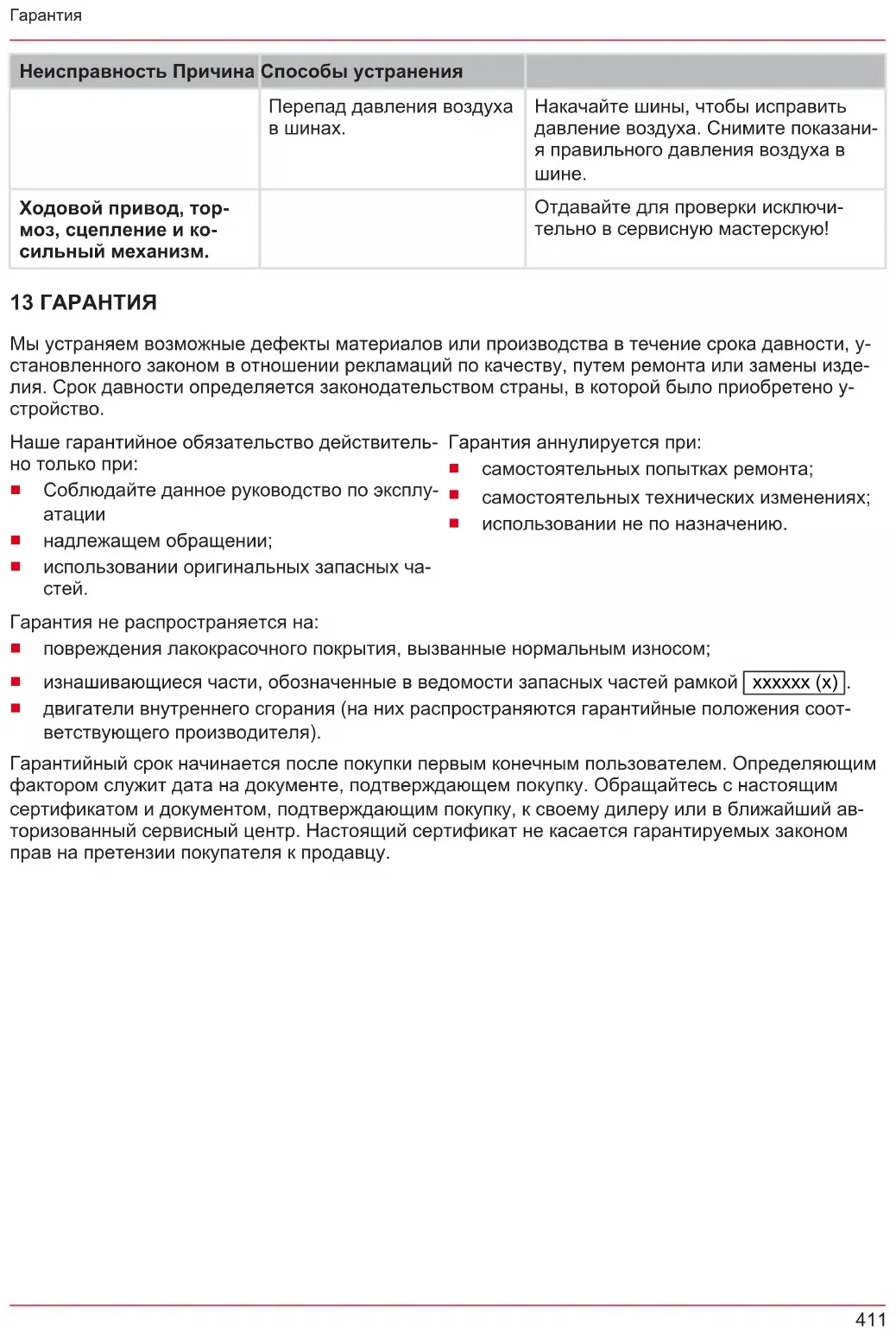Накачайте шини, щоб виправити тиск повітря. Зніміть показання правильно- го тиску повітря в шині. Ходовий привід, галь- мо, зчеплення і косиль- ний механізм. Віддавайте на перевірку виключно в сервісну майстерню! 13 ГАРАНТІЯ До закінчення строку давності рекламацій, установленого за законом, виробник усуває можливі дефекти матеріалу чи виробничий брак шляхом ремонту або заміни (на свій вибір). Строк дав- ності визначається законодавством країни, у якій прилад було куплено. Гарантія зберігається лише за таких умов: