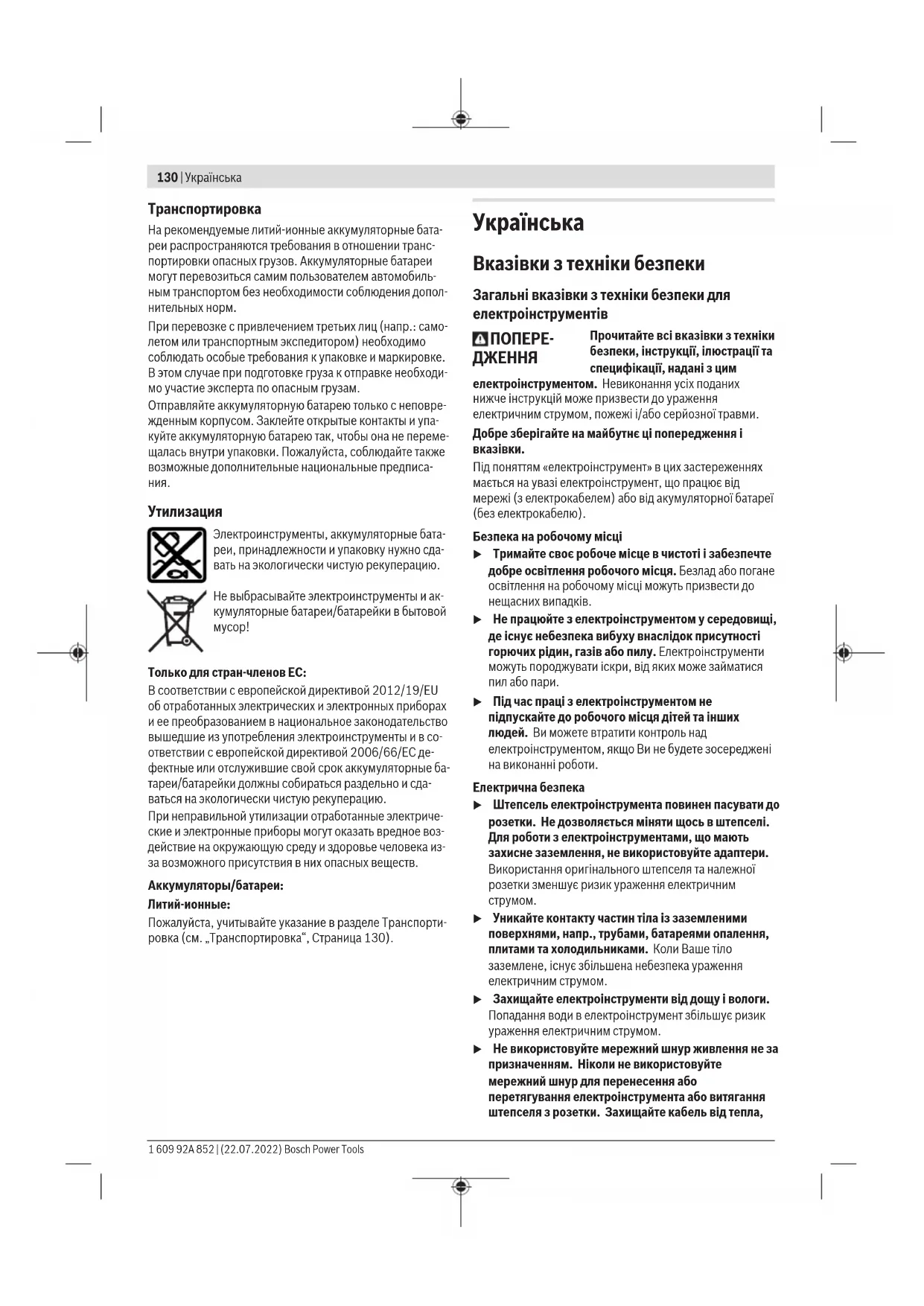 Лише для країнЄС: Відповідно до Європейської Директиви 2012/19/EU щодо відходів електричного та електронного обладнання та її перетворення в національне законодавство електроінструменти, які більше не придатні до використання, а також відповідно до Європейської Директиви 2006/66/EC несправні або відпрацьовані акумуляторні батареї/батарейки повинні здаватися окремо і утилізуватися екологічно чистим способом. При неправильній утилізації відпрацьовані електричні та електронні прилади можуть мати шкідливий вплив на навколишнє середовище та здоров’я людини через можливу наявність небезпечних речовин. Bosch Power Tools 1 609 92A 852 | (22.07.2022)138 | Қазақ Акумулятори/батарейки: Літієво-іонні: Будь ласка, зважайте на вказівки в розділі Транспортування (див. „Транспортування“, Сторінка137).